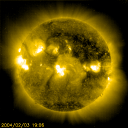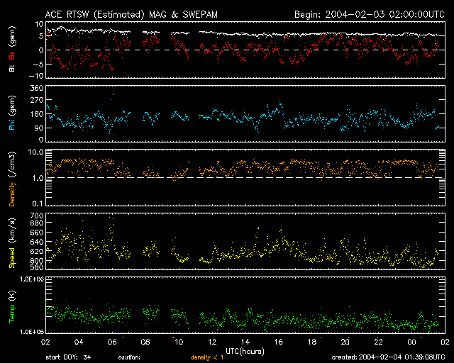 2004/ 2/ 4 10:40 更新 太陽風は600km/秒と高速状態が続いています。磁気圏は比較的静かです。 担当 篠原 太陽風の速度(ACEデータの黄色線)は600km/秒台を増減しながら、高速な状態を続けています。 これは、SOHO衛星のEIT 284カメラによる太陽画像の、 西側(右側)半分の上寄りにうす暗く見えている、 コロナホールと呼ばれる領域から吹き出している高速なプラズマの流れの中に地球が入っているためです。 コロナホールは太陽の磁場が外部へ向かって開いている領域です。 磁場が開いているためにここから太陽のガスが吹き出し、高速な太陽風を作ります。 一方、太陽風の磁場(ACEデータの白線)は5nTで安定しています。 地球の磁気圏へのエネルギー流入に重要な、磁場の南向き成分(赤線のマイナス方向)を見ると、 時おり-5nTと強い南向きを向いていますが、多くは北寄りの傾向を示しています。 このためオーロラ活動は比較的低調だった様です。 オーロラ活動の目安となるAE指数は一日中ほぼ500nT以下の変動に留まっています。 現在の高速太陽風は、もう2〜3日継続することが予想されます。 SOHO EIT284カメラの太陽画像で、太陽は(西側)右側へ向かって自転しています。 コロナホールも次第に西側(右側)へ移動していきますが、 太陽の中心から西端(右端)へ半分ほど行き過ぎた地点が地球へ影響を及ぼす場所の目安になります。 太陽の赤道付近に広がるコロナホールの、左の端がこの点に達する頃が、高速風の終わる頃です。 SOHO衛星のEIT284カメラの映像 (c) SOHO (ESA & NASA)