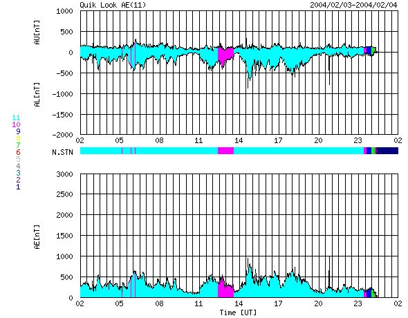 ACEが観測した太陽風の磁場(1番上の枠、白線は全体の強度、赤線は南北成分) および、太陽風の密度(3番目の橙線)、速度(4番目の黄線) (c) NOAA/SEC ![]() リアルタイムAE指数 下段のAEグラフの値が高くなると、オーロラ活動が活発化しています。 (c) 京都大学, CRL ![]() | |||||||||||||||||||||||||||||||||||