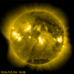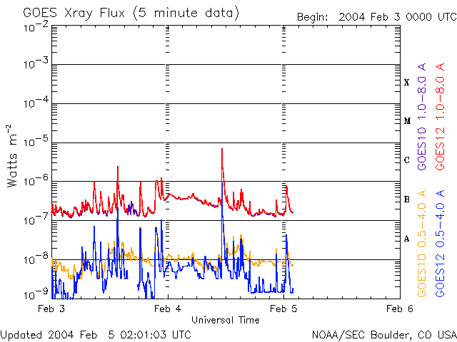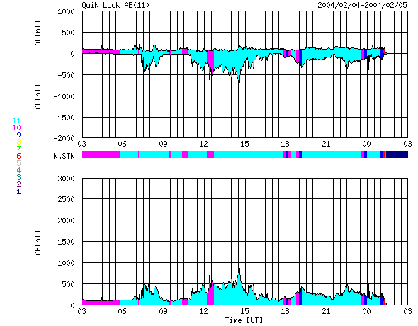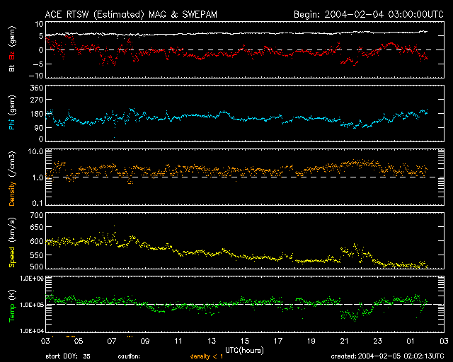 2004/ 2/ 5 11:01 更新 太陽風の速度は500km/秒まで低下しました。コロナホールの影響は抜けつつある様です。 担当 篠原 太陽風の速度(黄色線)は、600km/秒から500km/秒へ緩やかに低下しています。 コロナホールの影響は抜けつつある様です。 SOHO EIT284の太陽画像を見ると、コロナホール(やや暗く見えている領域)が 西側(右側)から中央部北寄り(上寄り)にかけて広がって見えています。 緯度が上がっているため、赤道付近のコロナホール程の強い影響は及ぼさないと思われますが、 現状程度の高速太陽風がもう数日程度続くかもしれません。 太陽風の磁場(白線)は5nTで安定して続いています。 南向き成分(赤線のマイナス方向)があまり現れていないため、磁気圏は比較的静穏だった様です。 オーロラの活動度を示すAE指数も500nT以下の活動が見られる程度でした。 4日20時(世界時4日11時)にC9.9の中規模フレア(太陽爆発)が発生しています。 これは太陽黒点画像に見える547群が起こしたものです。 現在見えている活動領域に活発なものはなく、大きなフレアを起こすことは無さそうです。 SOHO衛星のEIT284カメラの映像 (c) SOHO (ESA & NASA)
