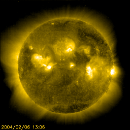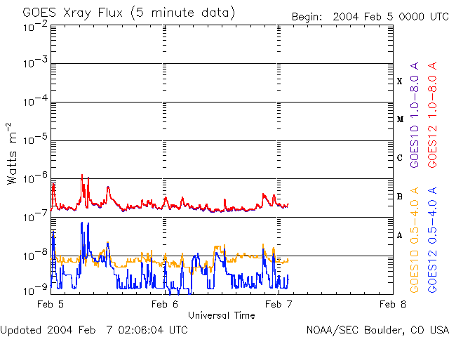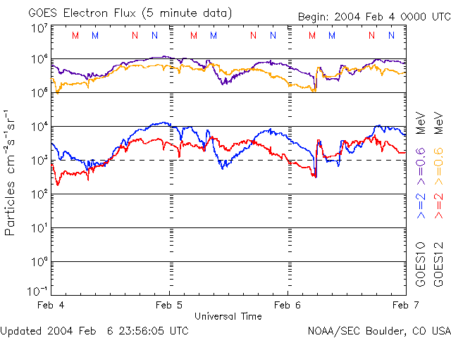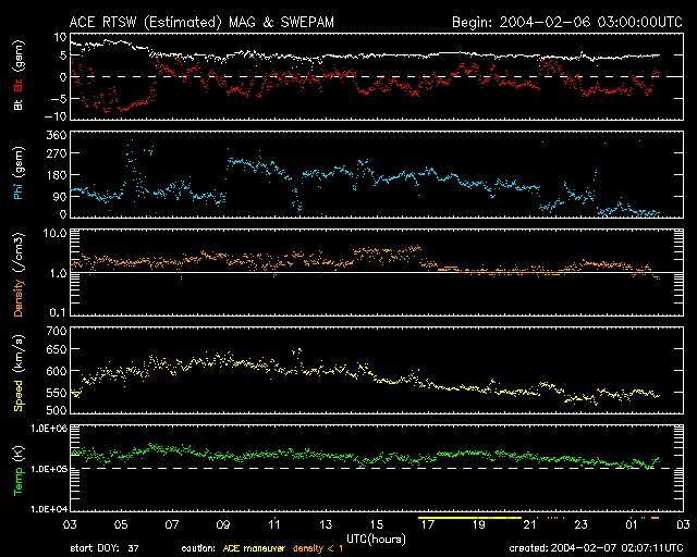 2004/ 2/ 7 11:06 更新 太陽風の速度は600km/秒まで上昇しています。オーロラ活動がやや活発になっています。 担当 篠原 太陽風の速度(ACE衛星の黄色線)は高い状態が続いています。 6日15時(世界時6日6時)に再び600km/秒を超え、現在も550km/秒とやや高速な状態が続いています。 太陽風磁場の南向き成分(赤線)は、-5nT弱の成分が頻繁に現れています。 太陽風が高速だったため、オーロラ活動もやや活発に見られた様です。 オーロラ活動を示すAE指数は500〜1000nTの変化を示しています。 SOHO EIT284カメラに見えるコロナホールは、大部分が西へ(右へ)移動しました。 ここからの影響はそろそろ無くなると思われます。 一方、太陽風磁場の動きを見ると、磁場構造のセクターの切り替わりが近づいている様です。 引き続き、この影響で太陽風が乱れる可能性があります。 太陽黒点は551群がやや規模を大きくしています。 フレア活動は低調で、551群が小さめのMクラス(中規模)フレアを起こすかもしれない程度だと NOAA/SECはコメントしています。 静止衛星軌道の高エネルギー電子の量が増加しています(今日の1枚目の図)。 衛星運用に支障が現れ始めると言われる10の4乗のレベルを超えています。 GOES衛星による、静止衛星軌道における高エネルギー電子の変化 (c) NOAA/SEC ![]() SOHO衛星のEIT284カメラの映像 (c) SOHO (ESA & NASA)