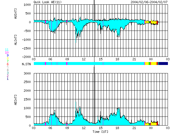 ACEが観測した太陽風の磁場(1番上の枠、白線は全体の強度、赤線は南北成分) および、太陽風の密度(3番目の橙線)、速度(4番目の黄線) (c) NOAA/SEC ![]() リアルタイムAE指数 下段のAEグラフの値が高くなると、オーロラ活動が活発化しています。 (c) 京都大学, CRL ![]() SOHO衛星のMDIカメラによる太陽黒点 (c) SOHO (ESA & NASA) ![]() GOES衛星の太陽X線データ (c) NOAA/SEC ![]() | |||||||||||||||||||||||||||||||||||||
