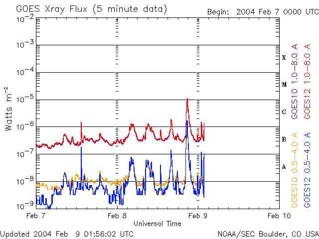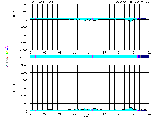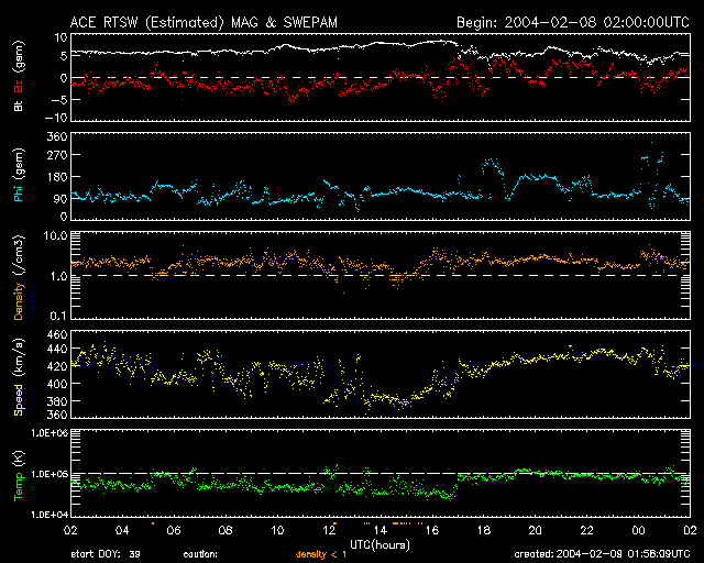 ACEが観測した太陽風の磁場(1番上の枠、白線は全体の強度、赤線は南北成分) および、太陽風の密度(3番目の橙線)、速度(4番目の黄線) (c) NOAA/SEC ![]() リアルタイムAE指数 下段のAEグラフの値が高くなると、オーロラ活動が活発化しています。 (c) 京都大学, CRL ![]() SOHO衛星のMDIカメラによる太陽黒点 (c) SOHO (ESA & NASA) ![]() GOES衛星の太陽X線データ (c) NOAA/SEC ![]() | ||||||||||||||||||||||||||||||||||||||