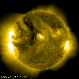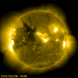 2004/ 2/ 9 10:59 更新 太陽風、磁気圏ともにたいへん静かです。 担当 篠原 ACE衛星の観測によると、太陽風の速度(黄色線)は400km/秒台が続いています。 このため磁気圏内もたいへん静かで、オーロラ活動も非常に低調だった様です。 AE指数を見ると、昨日一日ほとんど変化が見られていません。 この状態は、SOHO EIT284カメラに見える、次のコロナホールの接近まで続くと思われます。 そのコロナホールですが、太陽が前回同じ面を地球に向けていた27日前の様子と比較すると、 形には変化が見られるものの、ほとんど同じ位置に見えています。 このことから、前周期の太陽風の変化から今周期の擾乱開始の予想が立てられそうです。 以前の記録(1月16日)より、1月15日の夜から太陽風の速度が上昇した事が分かります。 今回も同様の変化をするならば、2月11日以降にコロナホールの影響が始まると予想されます。 太陽黒点では、新しく554群が東端(左端)から上ってきました。 上って早々、9日5時(世界時8日20時)にM1の中規模フレアを起こしています。 この554群と551群にはMクラスの中規模フレアを起こす可能性があるとの事です。 SOHO衛星のEIT284カメラの映像 (c) SOHO (ESA & NASA)