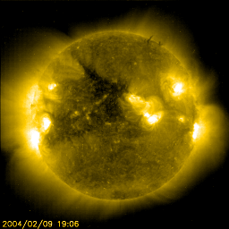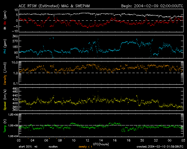 2004/ 2/10 11:00 更新 引き続き太陽風、磁気圏ともに静かです。小規模ですがフレアが頻発しています。 担当 篠原 太陽風の速度は400km/秒前後が続いています(ACEデータの黄色線)。 このため、磁気圏は概ね静かでした。 太陽風の磁場が-5nTと南向きが続いたなど、方向を変化させた時間帯があり、 そのためAE指数によるとオーロラ活動が見られた時間もあった様ですが、 太陽風の速度が遅いため小規模な擾乱に留まっています。 SOHO EIT284カメラでは、コロナホール(太陽表面中央の暗くなっている領域)が ゆっくりと西(右)へ進んでいます。 現在の位置関係から考えて、12日頃からコロナホールによる太陽風速度の上昇が始まると予想されます。 また、セクターの切り替わりもまだ終わっておらず、これによる短期的な擾乱も予想されます。 太陽黒点画像に見える554群は活発にCクラスの小規模フレアを起こしています。 昨日は5時半に最大M1.2のフレアを発生させました。 この活動領域は現在も範囲を広げています。 引き続きMクラスの中規模フレアを発生させる可能性があるとの事です。 SOHO衛星のEIT284カメラの映像 (c) SOHO (ESA & NASA)