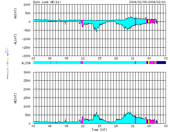ACEが観測した太陽風の磁場(1番上の枠、白線は全体の強度、赤線は南北成分) および、太陽風の密度(3番目の橙線)、速度(4番目の黄線) (c) NOAA/SEC ![]() リアルタイムAE指数 下段のAEグラフの値が高くなると、オーロラ活動が活発化しています。 (c) 京都大学, CRL ![]() SOHO衛星のMDIカメラによる太陽黒点 (c) SOHO (ESA & NASA) ![]() GOES衛星の太陽X線データ (c) NOAA/SEC ![]() | ||||||||||||||||||||||||||||||||||||||