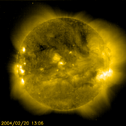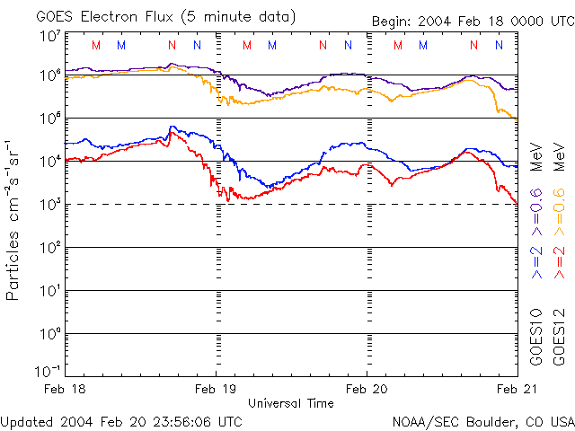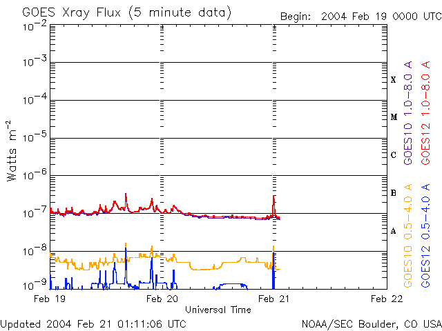 2004/ 2/21 10:11 更新 宇宙天気はたいへん穏やかです。太陽風速度は400km/秒です。 担当 篠原 太陽から磁気圏にかけてたいへん穏やかな状態が続いています。 静止衛星軌道の高エネルギー電子だけは、現在も10の4乗レベルを保っています。 次第に減少していますので、もう2日程で警戒域から下がりそうです。 太陽風の速度(黄色線)は400km/秒と静穏レベルが続いています。 太陽風の磁場強度(白線)は5nTを越えていますが概ね北向きでした。 -5nTと大きく南を向いた(赤線)時間帯もありましたが、 太陽風の速度が遅いために目立った擾乱には発達していません。 オーロラ活動を示すAE指数は、この南を向いた時間帯にやや活動的になった程度で、 ほぼ一日を通して静かでした。 太陽黒点はたいへん少なくなっています。 X線のレベルも下がっており、フレア活動もほとんど見られません。 今日、小さなコロナホールの影響で、太陽風の速度に変化が見られるかもしれません。 SOHO EIT284カメラにはコロナホールは見られません。 しばらくこのまま静かな日が続きそうです。 GOES衛星による、静止衛星軌道における高エネルギー電子の変化 (c) NOAA/SEC ![]() SOHO衛星のEIT284カメラの映像 (c) SOHO (ESA & NASA)