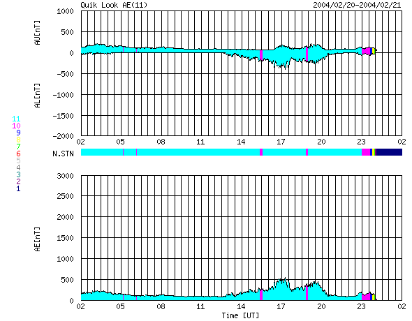 ACEが観測した太陽風の磁場(1番上の枠、白線は全体の強度、赤線は南北成分) および、太陽風の密度(3番目の橙線)、速度(4番目の黄線) (c) NOAA/SEC ![]() リアルタイムAE指数 下段のAEグラフの値が高くなると、オーロラ活動が活発化しています。 (c) 京都大学, CRL ![]() SOHO衛星のMDIカメラによる太陽黒点 (c) SOHO (ESA & NASA) ![]() GOES衛星の太陽X線データ (c) NOAA/SEC ![]() | |||||||||||||||||||||||||||||||||||||||