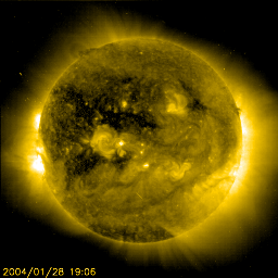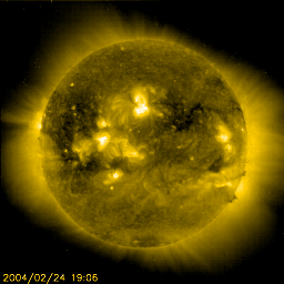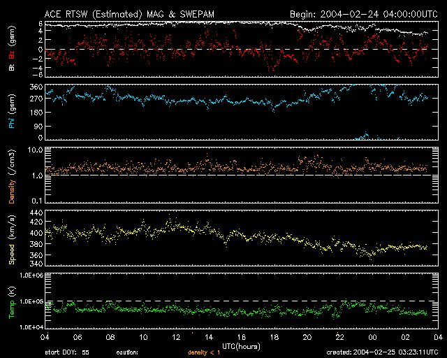 2004/ 2/25 12:21 更新 太陽風は静かな状態が続いています。オーロラはやや活発です。 担当 篠原 太陽風の速度(ACEの黄色線)は400km/秒が続き、静かな状態を保っています。 一方、磁場の強度(白線)は5nT前後あり、南向き成分(赤線のマイナス成分)が頻繁に現れたためか、 オーロラ活動はやや活発になっていました。 AE指数を見ると500nT前後の変動が継続して見られています。 セクター構造の切り替わりはまだ起こっていません。 一時的に反転が見られましたが、再び前の状態に戻っています。 SOHO EIT284カメラの太陽画像をご覧下さい。 27日前の前回太陽が同じ面を地球に向けていた1月28日の画像を右側に並べています。 太陽の中心付近の様子が随分変わっています。 前周期の画像では、コロナホールが中心から東側(左側)へ大きく広がって見えますが、 今日の画像では中心付近に明るい活動領域が見られ、コロナホールは東側(左側)へ狭くなっています。 太陽面のこの領域の状態が、一周してい間に大きく変化したのでしょう。 セクターの切り替わりが遅くなっているのも、この変化と関連していると思われます。 コロナホールの分布が大きく変わっていますので、今後の高速太陽風の開始も遅くなりそうです。 前周期では2日後くらいから高速状態に変わっていましたが、 今周期はあと6日程度は現在の穏やかな状態が続くと思われます。 太陽黒点は引き続き数を増やしています。 フレア(太陽爆発)活動は低調で、Cクラスの小規模フレアが予想される程度とのことです。 SOHO衛星のEIT284カメラの映像 (c) SOHO (ESA & NASA)