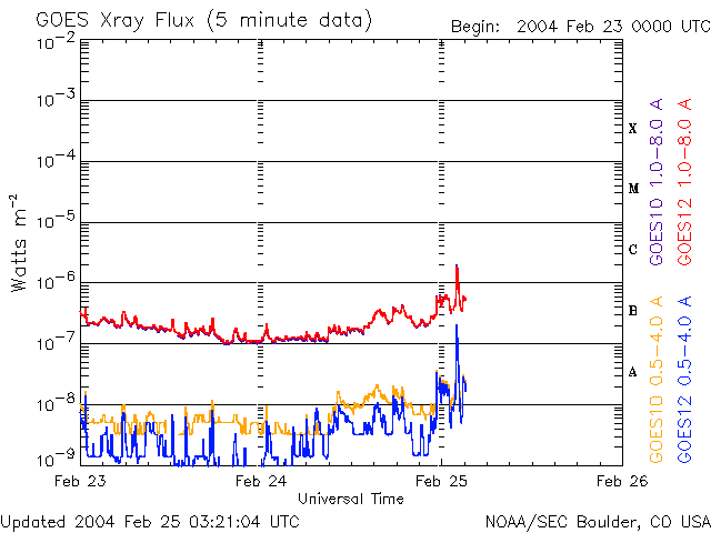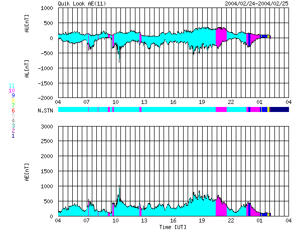 ACEが観測した太陽風の磁場(1番上の枠、白線は全体の強度、赤線は南北成分) および、太陽風の密度(3番目の橙線)、速度(4番目の黄線) (c) NOAA/SEC ![]() リアルタイムAE指数 下段のAEグラフの値が高くなると、オーロラ活動が活発化しています。 (c) 京都大学, CRL ![]() SOHO衛星のMDIカメラによる太陽黒点 (c) SOHO (ESA & NASA) ![]() GOES衛星の太陽X線データ (c) NOAA/SEC ![]() | ||||||||||||||||||||||||||||||||||||||||