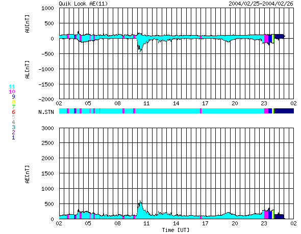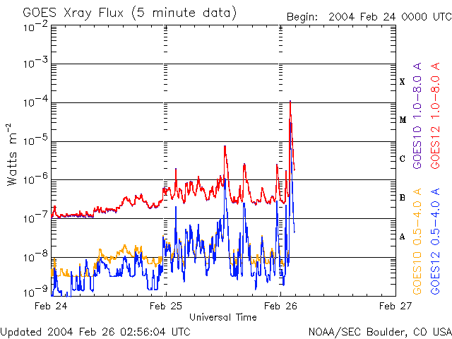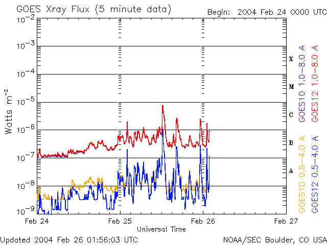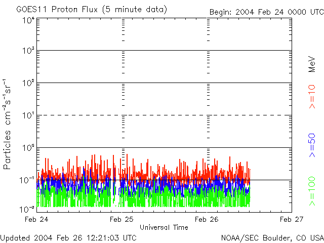 ACEが観測した太陽風の磁場(1番上の枠、白線は全体の強度、赤線は南北成分) および、太陽風の密度(3番目の橙線)、速度(4番目の黄線) (c) NOAA/SEC ![]() リアルタイムAE指数 下段のAEグラフの値が高くなると、オーロラ活動が活発化しています。 (c) 京都大学, CRL ![]() GOES衛星の太陽X線データ (c) NOAA/SEC ![]() SOHO衛星のMDIカメラによる太陽黒点 (c) SOHO (ESA & NASA) ![]() 2004/ 2/26 11:59 追加 GOES衛星の太陽X線データ (c) NOAA/SEC ![]() 2004/ 2/26 21:26 追加 GOES衛星の太陽放射線データ (c) NOAA/SEC ![]() | |||||||||||||||||||||||||||||||||||||||