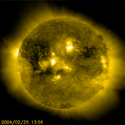 2004/ 2/26 10:58 更新 太陽風、磁気圏ともにたいへん穏やかです。太陽では小規模フレアが頻発しています。 2004/ 2/26 11:59 追加 X1.2の大規模フレアが発生しました。 2004/ 2/26 21:26 追加 太陽放射線の増加は見られていません。磁気嵐の恐れも少ない様です。 担当 篠原 太陽風の速度がとても下がっています。現在、320km/秒にまで低下しました。 オーロラ活動もほとんど見られず(AE指数参照)、磁気圏はたいへん穏やかです。 SOHO EIT284カメラの太陽画像を見ると、 太陽の北西寄り(右上寄り)に小さなコロナホール(やや暗い領域)が見えています。 この領域の影響があるとすると、今日一時的な速度の乱れが発生するかもしれません。 しかし、限定的な乱れに留まるでしょう。 また、太陽の東側(左側)には広い別のコロナホールが見えています。 太陽の自転のため、このコロナホールはゆっくり西側(右側)へ移動して行きます。 5日程後に地球へ影響を及ぼす地点に到達する見込みです。 太陽風の速度が再び上昇し、磁気嵐やオーロラ嵐をもたらす可能性があります。 太陽では、Cクラスの小規模フレア(太陽爆発)が頻発しています。 25日21時(世界時25日12時)にはCクラスとしては大きめのC8の小規模フレアが発生しています。 太陽黒点564群が領域を拡大し発達を続けているためです。 今後もCクラスの小規模フレア(場合によってはMクラスの中規模フレア)を発生させそうです。 2004/ 2/26 11:59 追加 (篠原) 関連の図はページの最後にあります GOES衛星のX線観測によると、 26日10時50分(世界時1時50分)にX1.2の大規模フレア(太陽爆発)が発生しました。 発生領域は、ニュースでも発達中とお知らせしていた564群です。 太陽放射線の増加や、磁気嵐発生の可能性などの追加情報にご注意ください。 2004/ 2/26 21:26 追加 (篠原) 関連の図はページの最後にあります GOES衛星による太陽放射線(高エネルギーのプロトン放射)の増加は観測されませんでした。 また、電波観測などの様子から、CME(太陽プラズマの大規模な放出現象)の可能性は低いとの事で、 磁気嵐などの擾乱を地球にもたらす可能性も少なそうです。 SOHO C3などの太陽画像が更新され次第、最終的な確認を行いたいと思います。 SOHO衛星のEIT284カメラの映像 (c) SOHO (ESA & NASA)