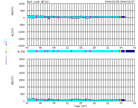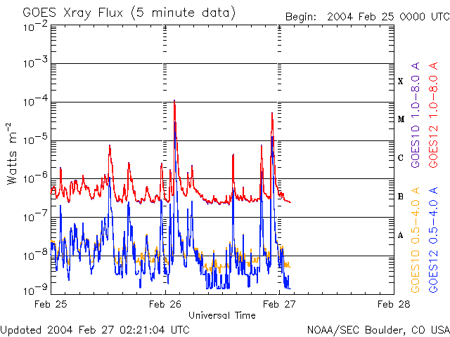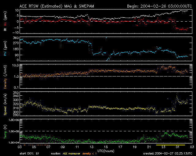 2004/ 2/27 11:27 更新 太陽フレアが頻発しています。セクターの切り替わりに伴い、磁気圏がしばらく乱れそうです。 担当 篠原 太陽黒点の564群が活発です。 複雑な形状に発達している様子を、SOHOの太陽画像で見る事ができます。 昨日のXクラスの大規模フレア(太陽爆発)以降も、中小規模のフレアを頻発させています。 今朝も、27日7時14分(世界時26日22時14分)にM5.7の中規模フレアを起こしました。 564群の活動には引き続き注意が必要です。 昨日のXフレアによるCME(太陽プラズマの大規模な放出現象)は発生しなかった様です。 SOHO画像には太陽ガスの放出は観測されていませんでした。 先日から何度もお伝えしていた、太陽風磁場のセクター構造の境界をやっと越えた様です。 前周期より3日遅れになっています。 それに伴い、太陽風の磁場強度(ACEデータの白線)が10nT近くに上昇しています。 また、南向き成分(赤線のマイナス成分)が急激に卓越し、-7nTの強さで継続的に現れています。 磁気圏のオーロラ活動が活発になる可能性が高いです。 ただし、太陽風の速度がたいへん遅い(330km/秒)ため、激しい擾乱にはならないと思われます。 コロナホールによる擾乱と違い、今後の展開が予想しにくいので注意してください。 昨日のオーロラ活動は非常に低調で、AE指数はほとんど変化が見られませんでした。 SOHO衛星のMDIカメラによる太陽黒点 (c) SOHO (ESA & NASA) ![]() GOES衛星の太陽X線データ (c) NOAA/SEC ![]() ACEが観測した太陽風の磁場(1番上の枠、白線は全体の強度、赤線は南北成分) および、太陽風の密度(3番目の橙線)、速度(4番目の黄線) (c) NOAA/SEC ![]() リアルタイムAE指数 下段のAEグラフの値が高くなると、オーロラ活動が活発化しています。 (c) 京都大学, CRL ![]() | ||||||||||||||||||||||||||||||||||||||