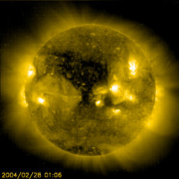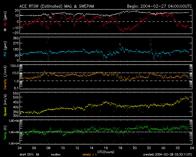 2004/ 2/28 12:34 更新 太陽風がやや乱れています。明後日頃からコロナホールの影響が始まります。 担当 篠原 太陽のフレア(太陽爆発)活動は、昨日の朝の中規模フレア以降は目立った爆発は起きていません。 しかし、黒点群の564群はその規模を保っており、 今後も大きなフレアを発生させる可能性がある様です。 昨日以降、太陽風がやや乱れた状態を続けています。 磁場強度(ACE衛星の白線)は10nT超が続き、 南向き成分(赤線のマイナス成分)も出入りの激しい変化をしています。 -10nT規模に大きく南を向いた時間帯では、オーロラ活動もやや活発になっていました(AE指数参照)。 だだし、太陽風の速度が400km/秒程度と遅かったので、あまり激しい擾乱にはなっていません。 SOHO EIT284カメラの太陽画像を見ると、 大規模なコロナホール(太陽表面のやや暗い領域)が、 太陽の北寄り(上寄り)の中心部から東(左)へ向けて大きく広がっています。 コロナホールからは大変速度の速い太陽風が吹き出しており、これが地球に当たると磁気嵐を起こします。 太陽の自転に伴って、このコロナホールは写真の右側へ移動して行きます。 コロナホールの先端(右側の端)が、太陽の中心と西の縁(右の縁)との中間に達した頃から 地球はその影響を受け始めます。 3月1日頃から注意が必要になると予想されます。 コロナホールの規模から考えて、4〜5日程度乱れが続く可能性があります。 SOHO衛星のEIT284カメラの映像 (c) SOHO (ESA & NASA)