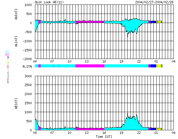 GOES衛星の太陽X線データ (c) NOAA/SEC ![]() SOHO衛星のMDIカメラによる太陽黒点 (c) SOHO (ESA & NASA) ![]() ACEが観測した太陽風の磁場(1番上の枠、白線は全体の強度、赤線は南北成分) および、太陽風の密度(3番目の橙線)、速度(4番目の黄線) (c) NOAA/SEC ![]() リアルタイムAE指数 下段のAEグラフの値が高くなると、オーロラ活動が活発化しています。 (c) 京都大学, CRL ![]() | |||||||||||||||||||||||||||||||||||||||