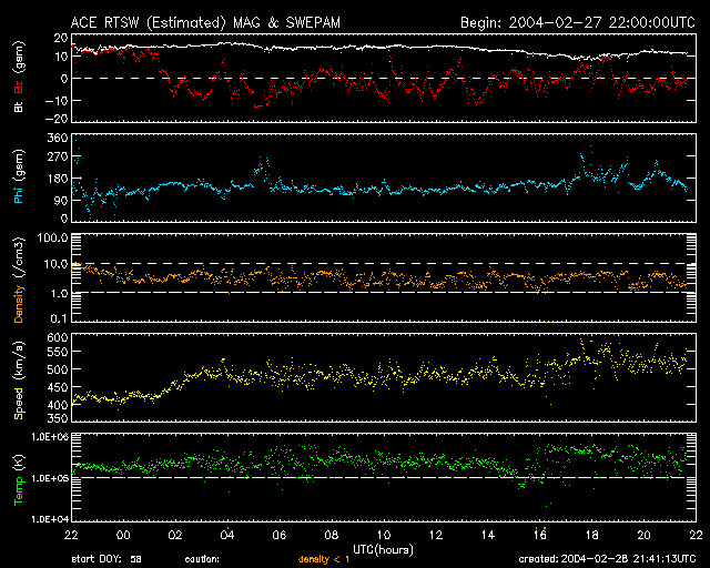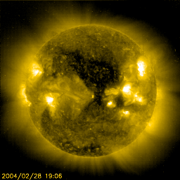 2004/ 2/29 06:42 更新 太陽風の速度が500km/秒に上昇しています。磁気圏がやや乱れています。 担当 篠原 太陽風の速度が上昇し、南向き磁場の変化のために磁気圏がやや乱れた状態になっています。 ACE衛星の観測によると、28日10時(世界時28日1時)頃から太陽風の速度が急に500km/秒へ上昇しました。 太陽風の磁場は10nTを越える強さを保ち、南向き成分が大きくなる時間帯も頻繁に現れました。 そのため、磁気圏は弱い磁気嵐の様な状態になっていた様です。 沖縄の磁場変化をみると、太陽風の乱れと共に、 静穏レベルである青線から離れて下へ下がっています(下がる程、磁気嵐としての発達を意味します)。 オーロラ活動も500nT程度の活動が度々見られました。 この太陽風速度の上昇の原因ははっきりしません。 SOHO EIT284カメラに見えるコロナホールの位置からは、影響は明日以降と思われるのですが、 既にその影響下に入っているのかもしれません。 いずれにせよ、明日以降はコロナホールによる本格的な太陽風の乱れが始まると予想されます。 磁気嵐の発達などが予想されますので、注意して下さい。 太陽のフレア(太陽爆発)活動は、一段落して、小規模フレアが時々見られる程度です。 ただ、黒点群の564群はまだ見えていますので、引き続き注意は必要でしょう。 SOHO衛星のEIT284カメラの映像 (c) SOHO (ESA & NASA)