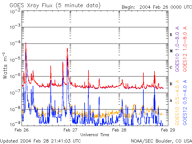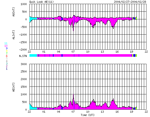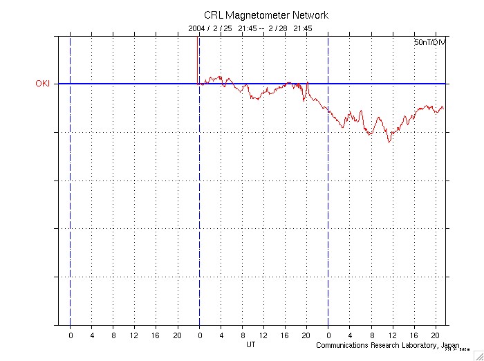ACEが観測した太陽風の磁場(1番上の枠、白線は全体の強度、赤線は南北成分) および、太陽風の密度(3番目の橙線)、速度(4番目の黄線) (c) NOAA/SEC ![]() 沖縄の磁場擾乱 下へ下がるほど、擾乱が発達している事を意味します。 (c) CRL ![]() リアルタイムAE指数 下段のAEグラフの値が高くなると、オーロラ活動が活発化しています。 (c) 京都大学, CRL ![]() GOES衛星の太陽X線データ (c) NOAA/SEC ![]() SOHO衛星のMDIカメラによる太陽黒点 (c) SOHO (ESA & NASA) ![]() | |||||||||||||||||||||||||||||||||||||||