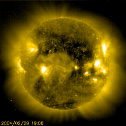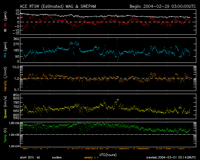 2004/ 3/ 1 11:15 更新 太陽風の速度が650km/秒へ上昇しています。磁気圏の乱れに注意して下さい。 担当 篠原 コロナホールの影響で、太陽風の速度が上昇しています。 予想よりも早く高速風の領域に入った様で、昨日のニュース以降も速度の高い状態が続き、 2月29日11時(世界時29日2時)頃からは600km/秒を超えています。 一方、太陽風の磁場強度(白線)は5nT程度に下がり、 磁気圏の乱れを起こす磁場南向きの成分(赤線のマイナス成分)も弱い変化に留まっています。 そのため、沖縄の磁場変化を見たところ、現時点では大きな擾乱には発達していない様です。 ただし、太陽風の速度がたいへん速くなっていますので、 太陽風の磁場成分の変化によって、急にオーロラ活動が活発になる可能性があり、注意が必要です。 SOHO EIT284カメラの太陽画像を見ると、 この高速風の源となっているコロナホール(太陽の中心付近に見えるやや暗い領域)は、 太陽の北半球(上半分)を中心に、東西(左右)に大きく広がっています。 現在地球に影響を及ぼしているのは、西側(右側)の領域です。 コロナホールの広がりから考えて、今後5〜6日程度高速風が続く可能性があります。 先週大きなフレア(太陽爆発)を起こした太陽黒点の564群は次第に太陽の西縁に近づいています。 このところ目立ったフレアは発生していませんが、 中規模のフレアを起こす可能性はまだ残っているとのことです。 SOHO衛星のEIT284カメラの映像 (c) SOHO (ESA & NASA)
