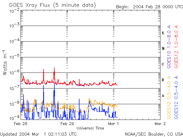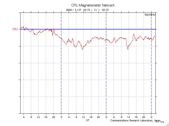 ACEが観測した太陽風の磁場(1番上の枠、白線は全体の強度、赤線は南北成分) および、太陽風の密度(3番目の橙線)、速度(4番目の黄線) (c) NOAA/SEC ![]() 沖縄の磁場擾乱 下へ下がるほど、擾乱が発達している事を意味します。 (c) CRL ![]() SOHO衛星のMDIカメラによる太陽黒点 (c) SOHO (ESA & NASA) ![]() GOES衛星の太陽X線データ (c) NOAA/SEC ![]() | |||||||||||||||||||||||||||||||||||||||