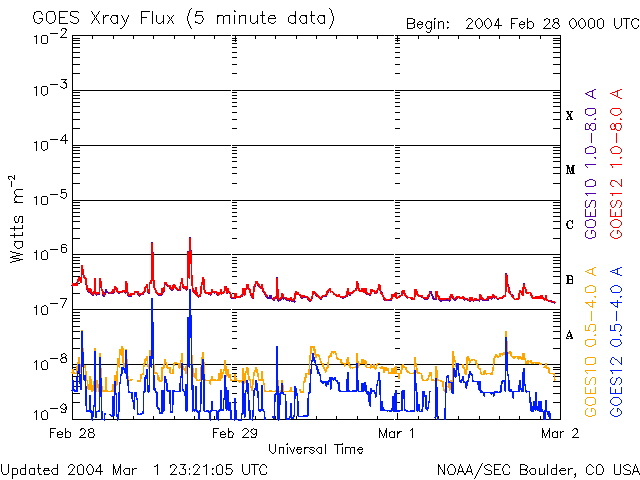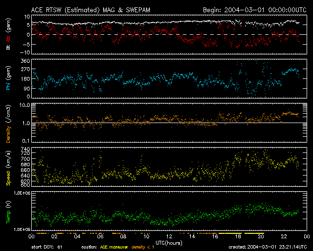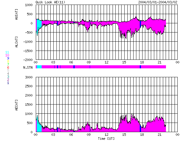 ACEが観測した太陽風の磁場(1番上の枠、白線は全体の強度、赤線は南北成分) および、太陽風の密度(3番目の橙線)、速度(4番目の黄線) (c) NOAA/SEC ![]() リアルタイムAE指数 下段のAEグラフの値が高くなると、オーロラ活動が活発化しています。 (c) 京都大学, CRL ![]() SOHO衛星のMDIカメラによる太陽黒点 (c) SOHO (ESA & NASA) ![]() GOES衛星の太陽X線データ (c) NOAA/SEC ![]() | |||||||||||||||||||||||||||||||||||||||