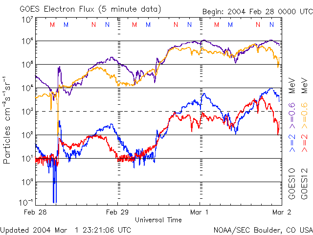 2004/ 3/ 2 08:22 更新 高速太陽風が続いています。オーロラ活動が活発になっています。 担当 篠原 太陽風の速度(ACEデータの黄色線)が高い状態が続き、600〜700km/秒の間で推移しています。 磁場の強さ(白線)も5nTの強さを保っており、 南向き成分(赤線のマイナス成分)が現れるとオーロラ活動が活発になっています。 1日22時〜2日6時(世界時1日13時〜1日21時)にかけて南向き成分が大きかった時間帯がありますが、 AE指数のグラフを見ると、この時間にオーロラ活動が活発になっていた事が分かります。 今後も、太陽風の速度が高い間は、太陽風磁場の南向き成分に対応して、 オーロラ活動が激しくなる事があるでしょう。 また、高速風の影響で静止軌道上の高エネルギー電子が急速に増加しています(1枚目の図)。 図の赤・青線が10の4乗の線を越えると、衛星に障害が起こり易くなると言われています。 この状態はしばらく続くと思われますので、注意が必要でしょう。 高速風の原因であるコロナホールですが、SOHO EIT284カメラの太陽画像に見られる様に、 一番広い領域が地球へ影響を及ぼす位置である西寄り(右寄り)の位置に来ています。 今日辺りが高速風のピークになるのではないでしょうか。 これからやってくるコロナホール(コロナホールの左半分側)は、 北半球側にやや緯度の高い領域に延びています。 このため、地球への影響はやや弱まる可能性があります。 太陽黒点の564群はいよいよ西縁に没しつつあります。 フレア(太陽爆発)活動もすっかり弱まり、目立った黒点群も無いので、 しばらく静かな状態が続くでしょう。 GOES衛星による、静止衛星軌道における高エネルギー電子の変化 (c) NOAA/SEC ![]() SOHO衛星のEIT284カメラの映像 (c) SOHO (ESA & NASA)