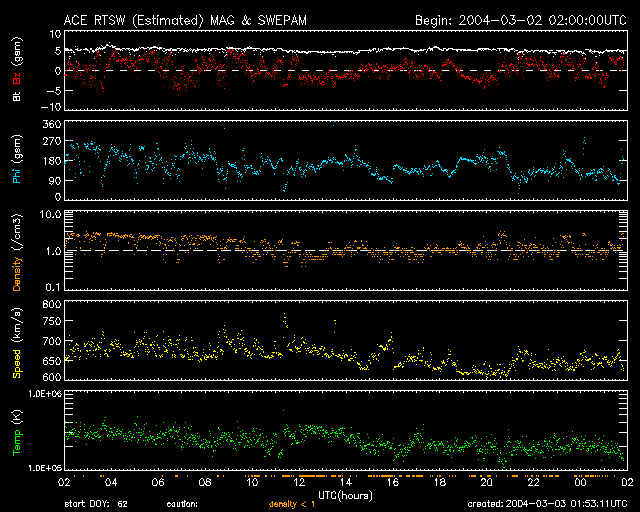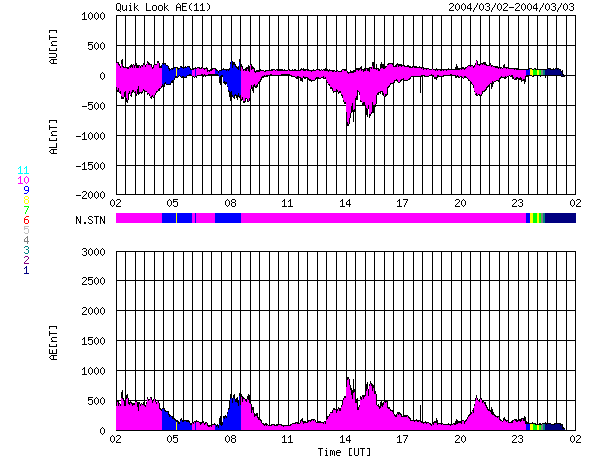 ACEが観測した太陽風の磁場(1番上の枠、白線は全体の強度、赤線は南北成分) および、太陽風の密度(3番目の橙線)、速度(4番目の黄線) (c) NOAA/SEC ![]() リアルタイムAE指数 下段のAEグラフの値が高くなると、オーロラ活動が活発化しています。 (c) 京都大学, CRL ![]() GOES衛星の太陽X線データ (c) NOAA/SEC ![]() SOHO衛星のMDIカメラによる太陽黒点 (c) SOHO (ESA & NASA) ![]() | |||||||||||||||||||||||||||||||||||||||