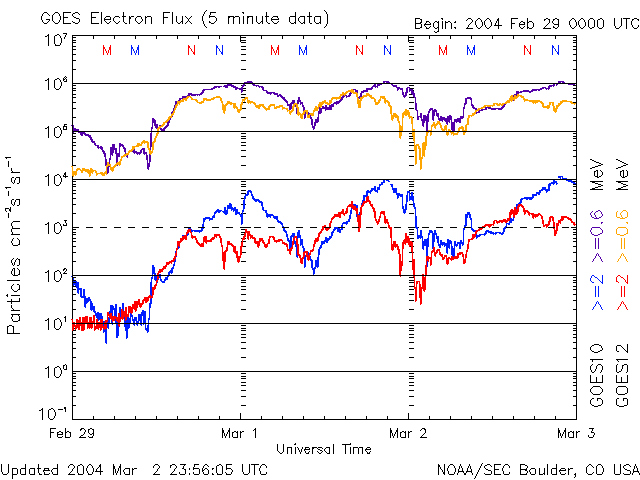 2004/ 3/ 3 10:54 更新 太陽風は650km/秒と高速です。オーロラ活動がやや活発になっています。 担当 篠原 太陽風は速度(黄色線)650km/秒を前後しつつ高速状態が続いています。 磁場強度(白線)も5nTで安定し、南向き成分(赤線のマイナス成分)が時折現れています。 その変化に合わせる様に、AE指数も500nT程度に発達する時間帯が見られ、 オーロラ活動もやや活発に続いている様です。 SOHO EIT284の太陽画像では、地球に高速風をもたらしているコロナホールは、 これから北半球(上半分)の緯度の高い領域に広がっていきます。 このため、高速風の影響がこれから弱まっていく可能性もあります。 今後、3日程度は注意が必要でしょう。 静止衛星軌道の高エネルギー電子も、警戒域(10の4乗の線)にちょうど達したところで推移しています。 衛星運用では、引き続き注意が必要でしょう。 今朝になって、C2クラスの小規模フレアが連続して発生しています。 これは黒点群の567群が起こしたものです。 567群は黒点数を増やしていますが、大きなフレアの発生は無い様です。 GOES衛星による、静止衛星軌道における高エネルギー電子の変化 (c) NOAA/SEC ![]() SOHO衛星のEIT284カメラの映像 (c) SOHO (ESA & NASA)