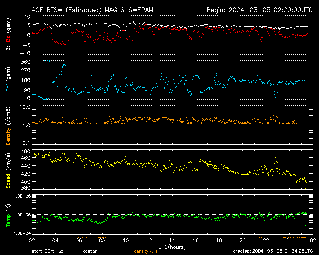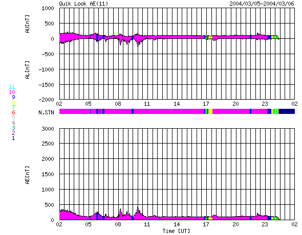 ACEが観測した太陽風の磁場(1番上の枠、白線は全体の強度、赤線は南北成分) および、太陽風の密度(3番目の橙線)、速度(4番目の黄線) (c) NOAA/SEC ![]() リアルタイムAE指数 下段のAEグラフの値が高くなると、オーロラ活動が活発化しています。 (c) 京都大学, CRL ![]() GOES衛星の太陽X線データ (c) NOAA/SEC ![]() SOHO衛星のMDIカメラによる太陽黒点 (c) SOHO (ESA & NASA) ![]() | |||||||||||||||||||||||||||||||||||||||