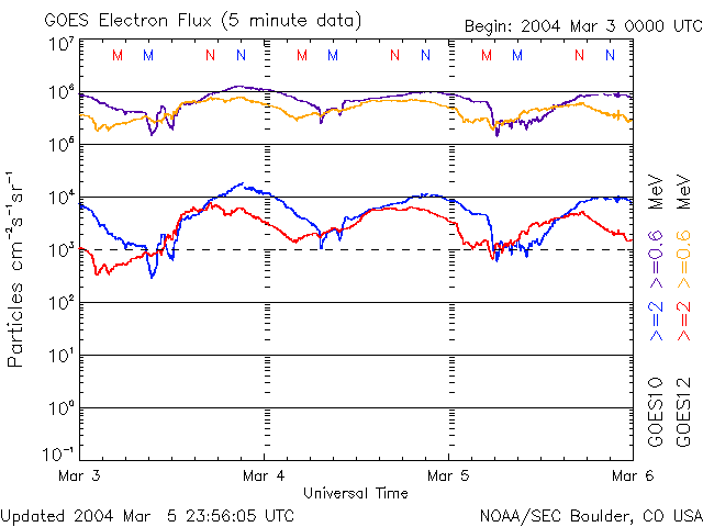 2004/ 3/ 6 10:35 更新 太陽風の速度は400km/秒まで下がり、磁気圏は静かになっています。 担当 篠原 太陽風の速度(ACE衛星の黄色線)は400km/秒に下がりました。 速度が遅くなったため、オーロラ活動は低調で、 オーロラの活動度を示すAE指数は変化がとても小さくなっています。 SOHO EIT284カメラの太陽画像では、太陽面の中心部にコロナホールは見られません。 東側(左側)寄りにコロナホール(太陽面のやや暗く見えている領域)が見えていますが、 この領域が地球に影響を及ぼすのは3月10日頃になる見込みです。 前周期の太陽風の変化を振り返ると、 コロナホールの前に太陽風磁場セクターの切り替わりがあります。 続いて、太陽風速度の上昇の前に磁場強度が急に強まり、弱い磁気嵐の状態になっていました。 3月9日頃からは注意が必要です。 太陽では、小規模フレアが度々起きています。 太陽黒点の567群が発生させているのですが、依然中規模のフレアを起こす可能性があるそうです。 静止衛星の高エネルギー電子の密度は現在も高いレベルが続いています。 太陽風の速度が下がりましたので、今後ゆるやかに減少するはずですが、 もうしばらく注意が必要でしょう。 GOES衛星による、静止衛星軌道における高エネルギー電子の変化 (c) NOAA/SEC ![]() SOHO衛星のEIT284カメラの映像 (c) SOHO (ESA & NASA)