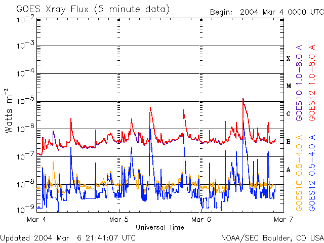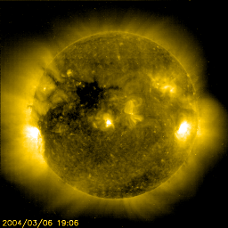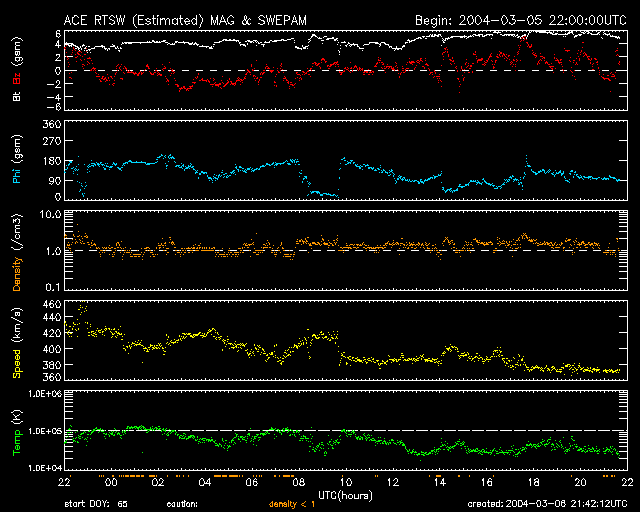 2004/ 3/ 7 06:43 更新 新しい黒点群が小規模フレアを頻発しています。磁気圏は静かです。 担当 篠原 太陽面で新しく、東端(左端)から黒点群の570群が上って来ました。 この黒点群が6日21時(世界時6日12時)にM1.3の小さい中規模フレアを起こしています。 また、C2前後の小さな小規模フレアも度々起こしています。 これからこの黒点群に対する注意が必要の様です。 太陽風の速度は(ACEの図の黄色線)、400km/秒を切るほどに遅くなっています。 太陽風磁場の南向き成分(赤線のマイナス成分)も目立つ時間帯は無く、 地球磁気圏はたいへん静かです。 オーロラ活動を表すAE指数は全く変化していません。 オーロラ活動は非常に低調だった様です。 SOHO EIT284カメラで、 太陽面のコロナホール(やや暗くなっている領域)がはっきり見えて来ました。 この規模から考えて、影響が始まると5日程度は高速太陽風が続きそうです。 今日から明日にかけて、引き続き静かな日が続くでしょう。 明日の夜以降、太陽風磁場のセクターの切り替わりが発生します。 その後、太陽風磁場に大きな乱れが発生し、 引き続きコロナホールによる太陽風速度の上昇が始まるでしょう。 今週は、磁気嵐が発生したりオーロラ活動が活発になる可能性が高いので注意して下さい。 SOHO衛星のEIT284カメラの映像 (c) SOHO (ESA & NASA)