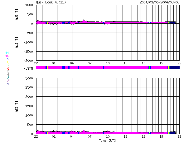 SOHO衛星のMDIカメラによる太陽黒点 (c) SOHO (ESA & NASA) ![]() GOES衛星の太陽X線データ (c) NOAA/SEC ![]() ACEが観測した太陽風の磁場(1番上の枠、白線は全体の強度、赤線は南北成分) および、太陽風の密度(3番目の橙線)、速度(4番目の黄線) (c) NOAA/SEC ![]() リアルタイムAE指数 下段のAEグラフの値が高くなると、オーロラ活動が活発化しています。 (c) 京都大学, CRL ![]() | |||||||||||||||||||||||||||||||||||||||