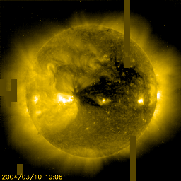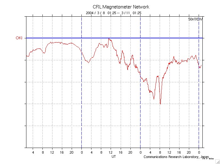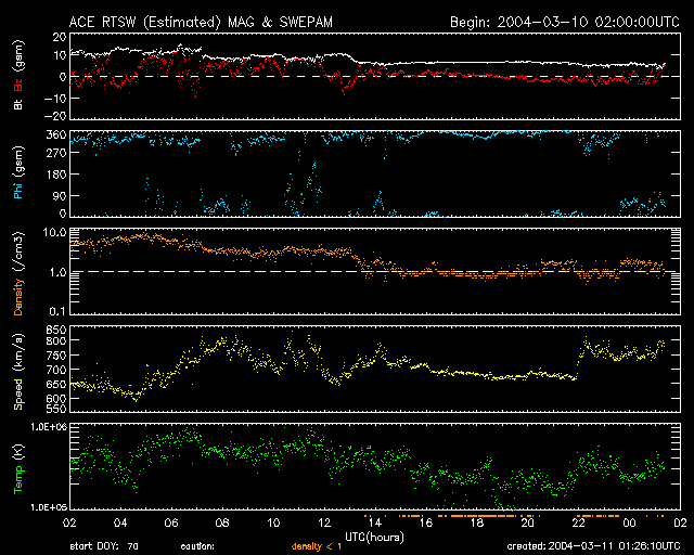 2004/ 3/11 10:25 更新 太陽風がたいへん高速です。磁気圏は小規模な磁気嵐状態になっています。 担当 篠原 ACE衛星の観測によると、太陽風の速度(黄色線)は750km/秒とたいへん高い状態が続いています。 磁気圏の擾乱も、昨日の朝から夕方にかけて特に活発で、 沖縄の磁場変化を見ると、静穏レベル(青線)から-150nTに及ぶ減少を示しています。 小規模な磁気嵐に発達したと言えそうです。 オーロラ活動も一日を通して活発で、AE指数では500nTを越える変化が度々見られています。 高速太陽風は今後4日程度は続くと予想されます。 SOHO EIT284カメラでは、高速風の原因であるコロナホールが太陽の中心に大きく見えています。 ただし、太陽風の磁場(白線)の強まりは山を越えた様です。 一時10nTを越えていた全磁場の強度(白線)は、5nT近くに下がっています。 27日前の前周期を見ても、一時的に強まった太陽風磁場は2日ほどで落ち着く傾向を見せています。 従って、高速風が続く間はオーロラ活動が活発になるなど磁気圏が乱れた状態は続くでしょうが、 磁気嵐などの極端に乱れた状態にまでは発達しないと思われます。 太陽黒点の570群は、現在もその大きな姿を見せています。 ただし、フレア活動は低調で、小規模フレアを起こす恐れがある程度との事です。 SOHO衛星のEIT284カメラの映像 (c) SOHO (ESA & NASA)