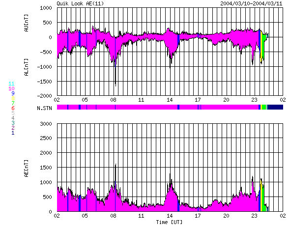 ACEが観測した太陽風の磁場(1番上の枠、白線は全体の強度、赤線は南北成分) および、太陽風の密度(3番目の橙線)、速度(4番目の黄線) (c) NOAA/SEC ![]() 沖縄の磁場擾乱 下へ下がるほど、擾乱が発達している事を意味します。 (c) CRL ![]() リアルタイムAE指数 下段のAEグラフの値が高くなると、オーロラ活動が活発化しています。 (c) 京都大学, CRL ![]() SOHO衛星のMDIカメラによる太陽黒点 (c) SOHO (ESA & NASA) ![]() | |||||||||||||||||||||||||||||||||||||||