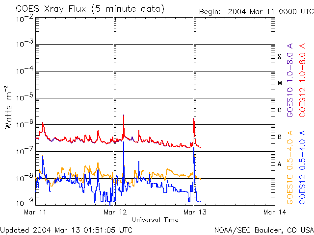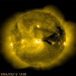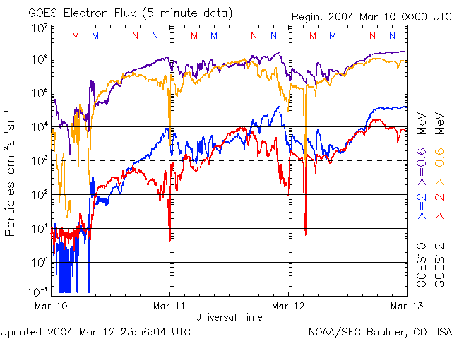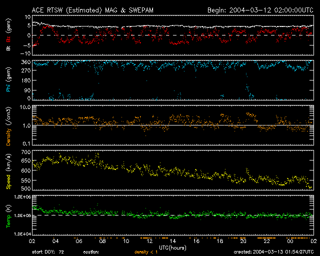 2004/ 3/13 10:55 更新 太陽風の速度はやや下がって550km/秒になりました。放射線帯の電子が増えています。 担当 篠原 太陽風の速度(ACE黄色線)はゆるやかに低下し、550km/秒に下がりました。 南向き磁場(赤線のマイナス成分)の変動が続いているため、 オーロラ活動は継続的に見られた様です。 AE指数は500nT前後の変化が続いています。 ただ、太陽風の速度が下がって来たため、激しい変動にはなっていません。 SOHO EIT284カメラでは、太陽面のコロナホールは西へ(右側)去りつつあります。 コロナホールの影響が続くのはあと2〜3日程度と思われます。 27日前の前周期の太陽風の変化を見ると、 今日、一時的に速度の再上昇が見られるかもしれません。 GOES衛星の観測によると、静止軌道の高エネルギー電子の密度が更に増加しています。 衛星の運用において障害が現れる可能性が高まっていますので、しばらく注意が必要です。 太陽のフレア(太陽爆発)活動は小さなフレアが見られる程度で、静かな状態が続いています。 黒点群の570群はほぼ地球正面に来ています。 小規模フレアを発生させる可能性があるそうです。 GOES衛星による、静止衛星軌道における高エネルギー電子の変化 (c) NOAA/SEC ![]() SOHO衛星のEIT284カメラの映像 (c) SOHO (ESA & NASA)