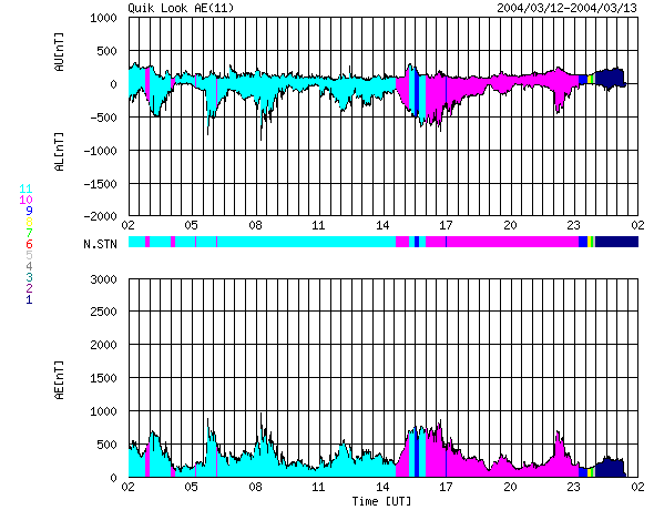 ACEが観測した太陽風の磁場(1番上の枠、白線は全体の強度、赤線は南北成分) および、太陽風の密度(3番目の橙線)、速度(4番目の黄線) (c) NOAA/SEC ![]() リアルタイムAE指数 下段のAEグラフの値が高くなると、オーロラ活動が活発化しています。 (c) 京都大学, CRL ![]() GOES衛星の太陽X線データ (c) NOAA/SEC ![]() SOHO衛星のMDIカメラによる太陽黒点 (c) SOHO (ESA & NASA) ![]() | |||||||||||||||||||||||||||||||||||||||