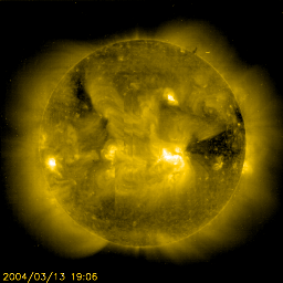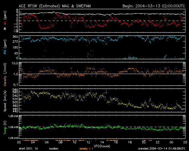 2004/ 3/14 10:50 更新 太陽風の速度は450km/秒まで下がりましたが、オーロラ活動は活発です。 担当 篠原 ACE衛星の観測によると、太陽風は速度450km/秒まで下がりました(黄色線)。 コロナホールの影響からは抜けつつある様です。 一方、太陽風の磁場(白線)は、5nT程度とあまり強くないのですが、 南向き成分(赤線のマイナス成分)が頻繁に現れていたために、 磁気圏へのエネルギーの流入が続き、オーロラ活動は比較的活発でした。 AE指数を見ると500nT前後の変動が続いています。 しかし、速度が既に低下していますので、これ以上激しい変化は起こらないでしょう。 昨日もお伝えしましたが、静止軌道の高エネルギー電子の増加状態が続いています。 赤線、青線ともに、衛星運用に障害が多くなると言われる10の4乗の線を越えています。 この状態は数日継続する可能性がありますので、引き続き注意が必要です。 今回のコロナホールはほぼ去ったと見られます。 SOHO EIT284カメラの太陽画像には、目立ったコロナホールは見られません。 これからしばらく静かな状態が続くでしょう。 太陽黒点570群が、きれいなふたつ目玉に見えています。規模は縮小傾向にある様です。 フレア(太陽爆発)も低調で、こちらも静かな状態が続きそうです。 SOHO衛星のEIT284カメラの映像 (c) SOHO (ESA & NASA)