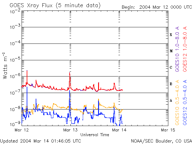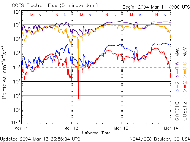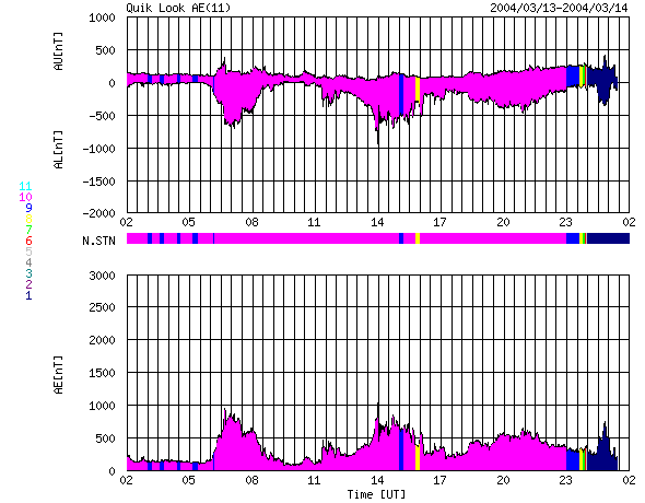 ACEが観測した太陽風の磁場(1番上の枠、白線は全体の強度、赤線は南北成分) および、太陽風の密度(3番目の橙線)、速度(4番目の黄線) (c) NOAA/SEC ![]() リアルタイムAE指数 下段のAEグラフの値が高くなると、オーロラ活動が活発化しています。 (c) 京都大学, CRL ![]() GOES衛星による、静止衛星軌道における高エネルギー電子の変化 (c) NOAA/SEC ![]() SOHO衛星のMDIカメラによる太陽黒点 (c) SOHO (ESA & NASA) ![]() GOES衛星の太陽X線データ (c) NOAA/SEC ![]() | |||||||||||||||||||||||||||||||||||||||