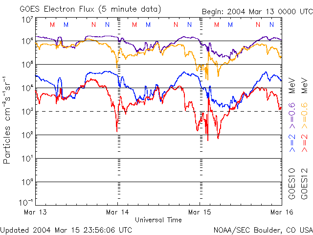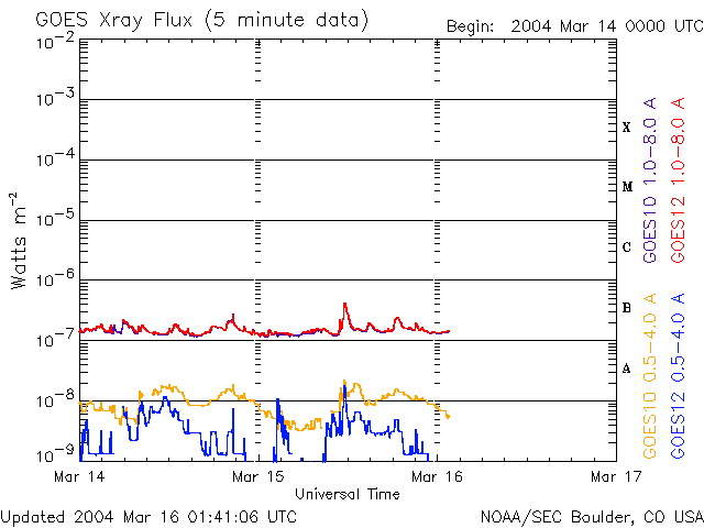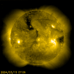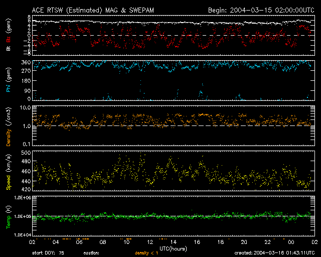 2004/ 3/16 10:41 更新 太陽フレア、磁気圏など宇宙天気は概ね静穏です。放射線帯電子の密度は高い状態です。 担当 篠原 太陽風の速度(ACEデータの黄色線)は400〜450km/秒で安定しています。 太陽風磁場は南向き成分(赤線のマイナス成分)が頻繁に変化するという状況が続いていますが、 オーロラの活動は一昨日よりもやや下がった様で、AE指数は500nT以下の変動に留まっています。 SOHO EIT284カメラの太陽画像には、太陽の北寄り(上側)に縦に伸びるコロナホールが見えています。 しかし、小規模であることと、緯度が高いことなどから地球への影響はほとんど無いでしょう。 これから1週間程度は静かな日が続くと予想されます。 4日ほど経つと次の乱れの要因となるコロナホールが太陽の東縁(左縁)から上がって来ますので 注目して下さい。 静止衛星の高エネルギー電子は高い状態が続いています。引き続き注意が必要です。 太陽黒点は2つ目玉で目立っている570群も活動度を下げており、 フレア(太陽爆発)活動はたいへん穏やかです。 SOHO衛星のEIT284カメラの映像 (c) SOHO (ESA & NASA)