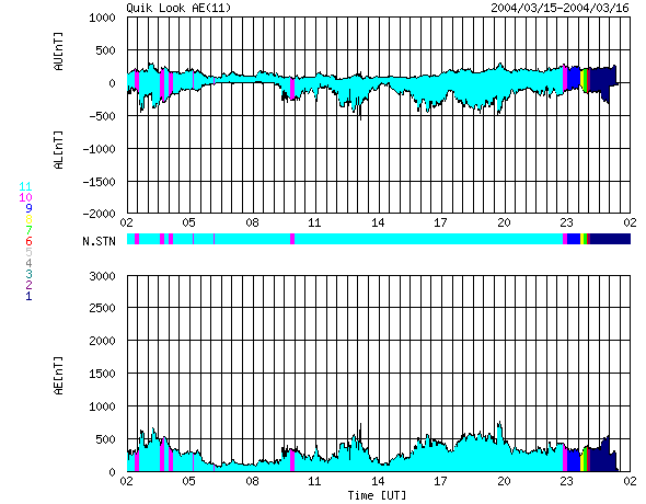 ACEが観測した太陽風の磁場(1番上の枠、白線は全体の強度、赤線は南北成分) および、太陽風の密度(3番目の橙線)、速度(4番目の黄線) (c) NOAA/SEC ![]() リアルタイムAE指数 下段のAEグラフの値が高くなると、オーロラ活動が活発化しています。 (c) 京都大学, CRL ![]() GOES衛星による、静止衛星軌道における高エネルギー電子の変化 (c) NOAA/SEC ![]() SOHO衛星のMDIカメラによる太陽黒点 (c) SOHO (ESA & NASA) ![]() GOES衛星の太陽X線データ (c) NOAA/SEC ![]() | |||||||||||||||||||||||||||||||||||||||
