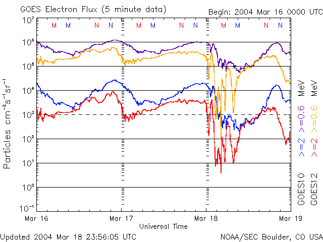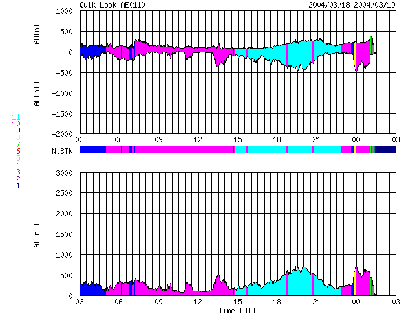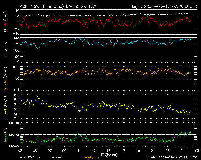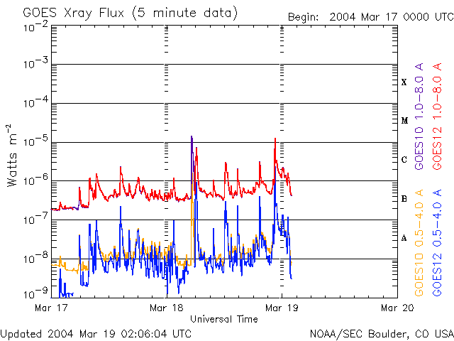 2004/ 3/19 11:06 更新 小規模フレアが活発に起きています。オーロラ活動も見られています。 担当 篠原 太陽で小規模ですがフレア(太陽爆発)が活発になっています。 17日以降Cクラスの小規模フレアが頻繁に現れています(今朝、M1の中規模フレアも発生しています)。 これは、太陽黒点写真に見える574黒点群と、まだ写真には微かにしか見えていませんが、 574群の左上方向の太陽東縁に現れて来た578群(番号はまだ記載されていません)が 活発に活動しているためです。 これからも中規模のフレアが発生する可能性があるそうです。 静止軌道の高エネルギー電子は更に減少しています。 注意ラインの10の4乗の線から下がったと考えて良い様です。 太陽風の速度(ACEの黄色線)は400km/秒から350km/秒近くまで下がっています。 一方、太陽風の磁場強度(白線)が徐々に強まっています。 このため、磁場のやや強い南向き成分(赤線のマイナス成分)が生じる様になり、 オーロラ活動をやや活発にしている様です。 太陽風の速度が遅いため、激しい活動ではありませんが、 AE指数が時として500nTを越える変化を示しています。 磁場強度の強まりは、太陽自転の前周期である27日前にも見られており、 この活動が3日程続く可能性があります。 GOES衛星の太陽X線データ (c) NOAA/SEC ![]() SOHO衛星のMDIカメラによる太陽黒点 (c) SOHO (ESA & NASA) ![]() GOES衛星による、静止衛星軌道における高エネルギー電子の変化 (c) NOAA/SEC ![]() ACEが観測した太陽風の磁場(1番上の枠、白線は全体の強度、赤線は南北成分) および、太陽風の密度(3番目の橙線)、速度(4番目の黄線) (c) NOAA/SEC ![]() リアルタイムAE指数 下段のAEグラフの値が高くなると、オーロラ活動が活発化しています。 (c) 京都大学, CRL ![]() | ||||||||||||||||||||||||||||||||||||||