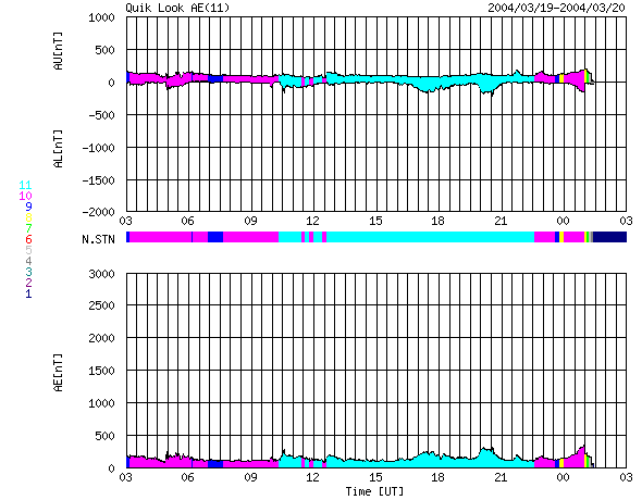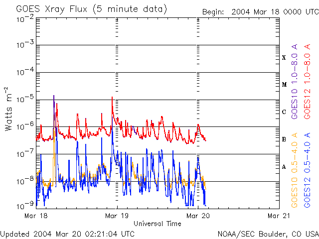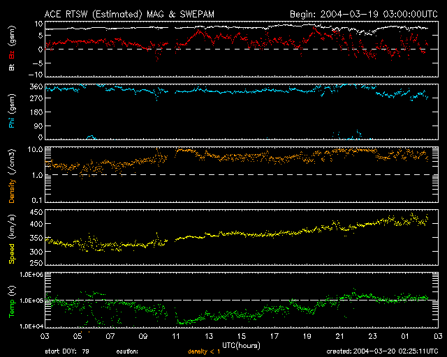 2004/ 3/20 11:26 更新 小規模フレアが活発に起きています。オーロラ活動は静かになっています。 担当 篠原 C1前後ととても小規模ですが、太陽フレア(太陽爆発)が活発に起きています。 太陽黒点の574群と、東縁から上がって来たばかりの578群が起こしています。 1.6MBとややファイルサイズが大きくなりますが、 http://sxi2.ngdc.noaa.gov/archive/browse/2004/03/19/SXI_20040319_000000_BB_G12_AR2_01D.MPG こちらでX線画像による1日のフレア活動を見る事ができます(NOAA/SEC)。 太陽面左側の574群、578群がチカチカと爆発し続けている様子を見る事ができます。 昨日、オーロラがやや活動的になっているとお知らせしましたが、 その後太陽風の磁場が北寄りに変わったため、オーロラの活動は低下しました。 磁場の強度は8nTとやや強いままですので、南向き傾向に変わると再びオーロラが活動的になると思われます。 ただし、太陽風の速度は400km/秒の静穏レベルですので、激しい活動に発達する事はないでしょう。 GOES衛星の太陽X線データ (c) NOAA/SEC ![]() SOHO衛星のMDIカメラによる太陽黒点 (c) SOHO (ESA & NASA) ![]() ACEが観測した太陽風の磁場(1番上の枠、白線は全体の強度、赤線は南北成分) および、太陽風の密度(3番目の橙線)、速度(4番目の黄線) (c) NOAA/SEC ![]() リアルタイムAE指数 下段のAEグラフの値が高くなると、オーロラ活動が活発化しています。 (c) 京都大学, CRL ![]() | ||||||||||||||||||||||||||||||||||||||