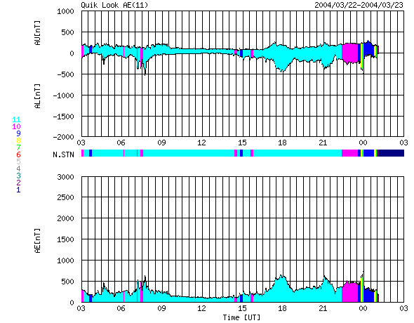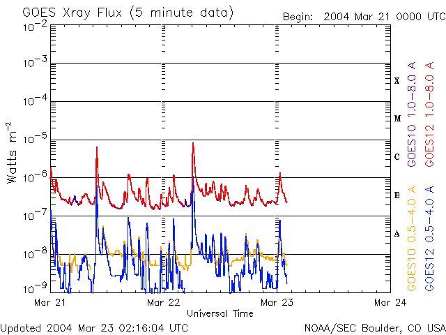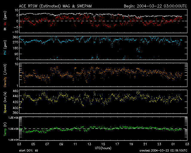 2004/ 3/23 11:20 更新 宇宙天気は今日も穏やかです。明後日以降、注意が必要になります。 担当 篠原 22日15時(世界時22日6時)にC8.6の大きめの小規模フレアが発生しました。 発生箇所は、574黒点群です(黒点の最新画像がありませんので、画像は掲載していません)。 今後も小規模フレア発生の可能性がある様です。 ACE衛星の太陽風観測によると、 太陽風の速度(黄色線)は少し上がって、420〜440km/秒で推移しています。 太陽風磁場(白線)はやや弱まり、4nT程度に下がっています。 南向き成分(赤線のマイナス成分)が時折現れており、AE指数によると弱いオーロラの活動が見られた様です。 この穏やかな状態は明日いっぱい続くと思われます。 明日の遅くか、明後日以降、太陽風に乱れが発生し、磁気圏を活動的にすると予想されます。 オーロラが活発になったり、放射線帯の高エネルギー電子が増加するなどの現象が見られるでしょう。 GOES衛星の太陽X線データ (c) NOAA/SEC ![]() ACEが観測した太陽風の磁場(1番上の枠、白線は全体の強度、赤線は南北成分) および、太陽風の密度(3番目の橙線)、速度(4番目の黄線) (c) NOAA/SEC ![]() リアルタイムAE指数 下段のAEグラフの値が高くなると、オーロラ活動が活発化しています。 (c) 京都大学, CRL ![]() | ||||||||||||||||||||||||||||||||||||||