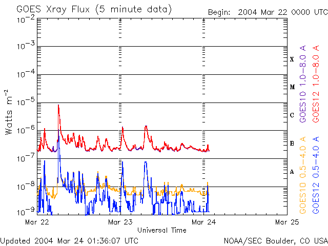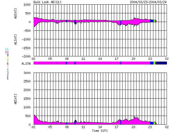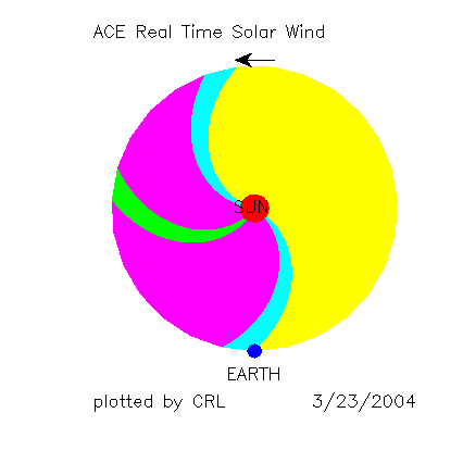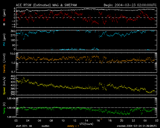 2004/ 3/24 10:40 更新 太陽、太陽風、磁気圏すべて穏やかです。太陽風磁場セクター境界が近づいています。 担当 篠原 太陽風は速度400km/秒を切って、現在は360km/秒に下がっています。 磁場の南向き成分の出現頻度が下がった事と重なって、オーロラ活動は低下しています。 AE指数では目立った変化は現れていません。 現在、太陽風磁場のセクター境界が近づいています。 27日前の前周期の様子から判断すると、今日から明日にかけて境界に達しそうです。 その後、コロナホールによる太陽風速度の上昇が起こり、 同時に磁場強度が急に強まって、磁気圏に強い擾乱をもたらすと予想されます。 乱れは6日間程度続きそうです。 オーロラが活発になり、弱い磁気嵐の様な状態になるかもしれません。 太陽表面の様子は常に変化しています。 太陽風の変化が前回の変化と必ず一致する訳ではありませんので、ご注意ください。 太陽X線の観測では、目立ったフレア活動は見られません。 黒点群の574群、578群がやや成長していますが、小規模フレアを起こす程度の様です。 太陽風磁場のセクター構造。桃色は地球向き、黄色は太陽向き。 (c) CRL ![]() ACEが観測した太陽風の磁場(1番上の枠、白線は全体の強度、赤線は南北成分) および、太陽風の密度(3番目の橙線)、速度(4番目の黄線) (c) NOAA/SEC ![]() リアルタイムAE指数 下段のAEグラフの値が高くなると、オーロラ活動が活発化しています。 (c) 京都大学, CRL ![]() GOES衛星の太陽X線データ (c) NOAA/SEC ![]() | ||||||||||||||||||||||||||||||||||||||