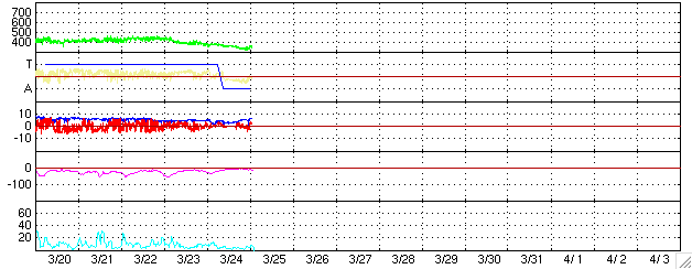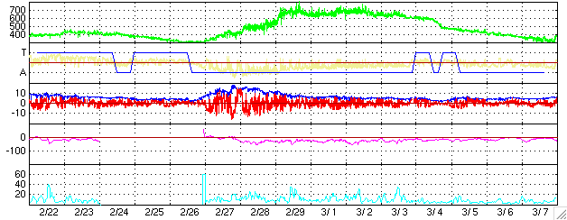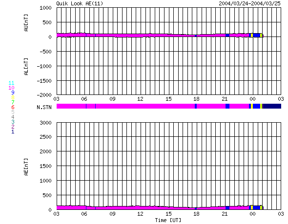 および、太陽風の密度(3番目の橙線)、速度(4番目の黄線) (c) NOAA/SEC ![]() リアルタイムAE指数 下段のAEグラフの値が高くなると、オーロラ活動が活発化しています。 (c) 京都大学, CRL ![]() | ||||||||||||||||||||||||||||||||||||||||||||||||||||||
