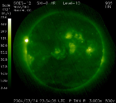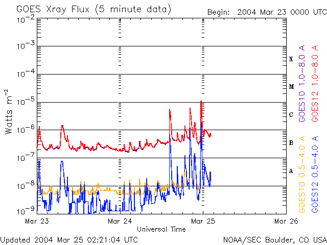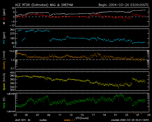 2004/ 3/25 11:21 更新 太陽面で活動的な領域が上がって来た様です。太陽風磁場のセクター境界を越えています 担当 篠原 今朝、25日8時(世界時24日23時)にM1.5の中規模フレアが発生しました。 GOES衛星のX線観測によると、太陽面の東縁(左縁)から活動的な領域が上がって来た様です。 この領域は直前にもC7の小規模フレアを発生させています。 今後の活動に注意が必要でしょう。 24日18時(世界時24日9時)頃に太陽風磁場のセクター境界を越えた様です。 今日の3枚目の図に、27日前の太陽風の変化と比較する図を掲載しています。 図の2列目の青線がセクター境界の変化を示しています( T→A に変わっています)。 この図によると、前周期とほぼ同じ位置に境界があった様です。 これから、2日ほどかけて太陽風の速度が次第に上昇することが予想されます(コロナホールの影響です)。 また、磁場強度がこれから急激に増加して、磁気圏擾乱を引き起こすことが予想されます。 ACEの磁場データを見ると、既に磁場強度の上昇の気配が見えています。 磁気嵐など本格的な擾乱に発達するのは、太陽風の速度が上昇した後となるでしょう。 GOES衛星の太陽X線画像による太陽フレア。25日8時(世界時24日23時) (c) NOAA ![]() GOES衛星の太陽X線データ (c) NOAA/SEC ![]() 27日の太陽周期に合わせたデータプロット (太陽風版) 太陽が同じ面を地球に向けていた27日前の変化から、今後を予想することができます。 (c) CRL