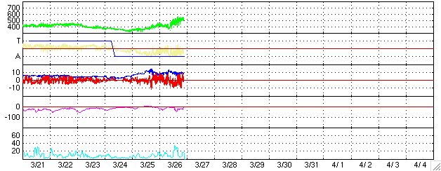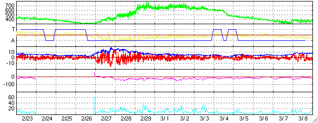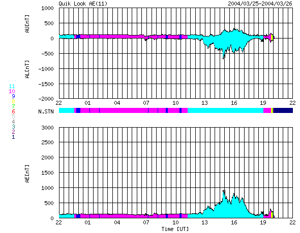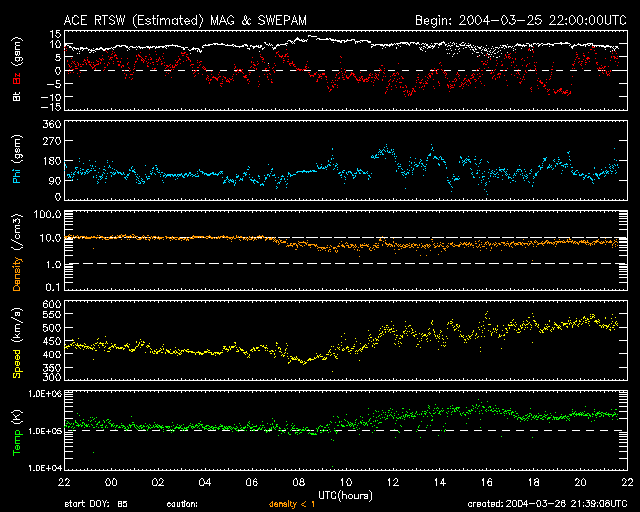 2004/ 3/27 06:40 更新 太陽風の速度が上昇しています。オーロラ活動もやや活発になっています。 担当 篠原 太陽風の速度が緩やかに上昇し、500km/秒に上がっています。 一方、太陽風磁場に南向き成分が現れる様になり、 そのためオーロラが活動的になってきました。 27日0時(世界時26日15時)頃に500nTを越える変化がAE指数のグラフに見えています。 27日前の前周期の変化を見ると、 これから1日ほどかけて更に700km/秒近くまで上昇する事が予想されます。 太陽風磁場の様子に依りますが、更にオーロラが活発になることも考えられます。 太陽フレアはひと休みで、落ち着いた状態になっています。 ACEが観測した太陽風の磁場(1番上の枠、白線は全体の強度、赤線は南北成分) および、太陽風の密度(3番目の橙線)、速度(4番目の黄線) (c) NOAA/SEC ![]() リアルタイムAE指数 下段のAEグラフの値が高くなると、オーロラ活動が活発化しています。 (c) 京都大学, CRL ![]() 27日の太陽周期に合わせたデータプロット (太陽風版) 太陽が同じ面を地球に向けていた27日前の変化から、今後を予想することができます。 (c) CRL