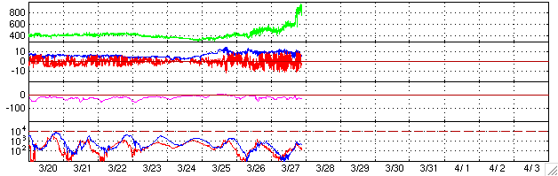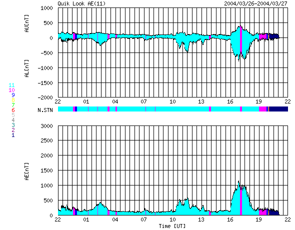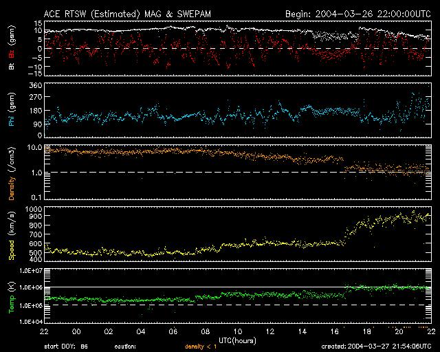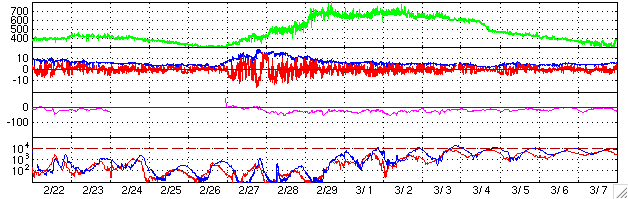 2004/ 3/28 06:55 更新 太陽風の速度が850km/秒と非常に高速です。オーロラ活動はやや活発です。 担当 篠原 ACE衛星の観測では、28日3時(世界時27日17時)から太陽風の速度が急に上昇し、 850km/秒と非常に高い速度に達しています。 磁場強度は5〜10nTの間で変化し、南向き成分は-5nT程度の強さが度々現れています。 太陽風の速度が非常に高速ですので、南向き磁場の出現頻度が高まれば、 オーロラなどの磁気圏擾乱が激しくなります。 磁気圏では、オーロラ活動が時折激しくなっています。 オーロラの活動度を示すAE指数のグラフでは、 28日3時(世界時27日17時)頃に1000nTに達する大きな変化が見られています。 ただ、太陽風の速度が高くなった後の時間帯には、まだ目立った活動は現れていません。 27日前の前周期の変化を見ると、高速太陽風は4日間ほど続きそうです。 前周期の場合は、この後磁場強度は次第に低下し、磁気圏の乱れは大きくなりませんでした。 ただし、太陽風の状況は常に変化していますので、高速風の間は注意が必要です。 一方、高速太陽風の影響で静止衛星軌道の高エネルギー電子の増加が予想されます。 これから2日ほどかけて10の4乗の警戒ラインに達すると予想されます。 (27日周期の図の一番下の欄をご覧下さい) 衛星の運用において注意が必要となるでしょう。 太陽フレア(太陽爆発)は現在は静かです。 582黒点群がやや勢力を広げており、中規模のフレアを起こす可能性もあるそうです。 ACEが観測した太陽風の磁場(1番上の枠、白線は全体の強度、赤線は南北成分) および、太陽風の密度(3番目の橙線)、速度(4番目の黄線) (c) NOAA/SEC ![]() リアルタイムAE指数 下段のAEグラフの値が高くなると、オーロラ活動が活発化しています。 (c) 京都大学, CRL ![]() 27日の太陽周期に合わせたデータプロット (放射線帯電子版) 太陽が同じ面を地球に向けていた27日前の変化から、今後を予想することができます。 (c) CRL