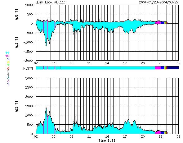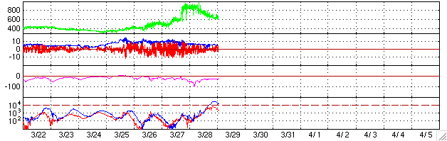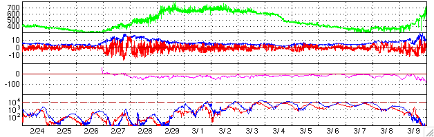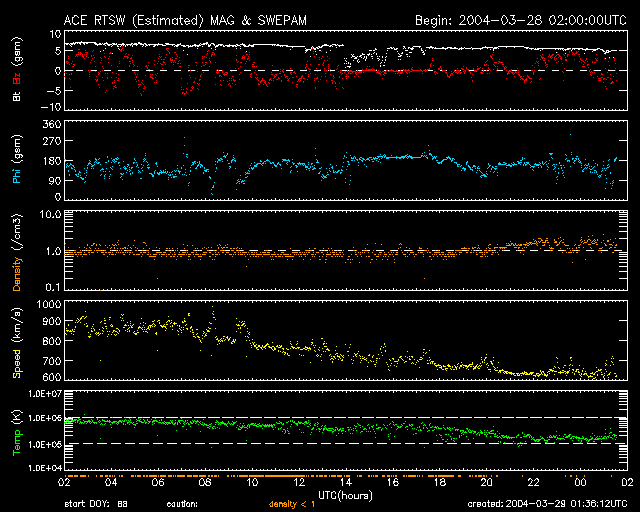 2004/ 3/29 10:35 更新 太陽風の速度は緩やかに低下し、600km/秒になりました。放射線帯電子の密度が上昇しています。 担当 篠原 一時900km/秒に達していた高速太陽風は、 28日17時(世界時28日8時)以降緩やかに低下を始め、600km/秒近くにまで下がりました。 この速度上昇に伴ってオーロラ活動がやや活発になり、 オーロラの活動度を示すAE指数のグラフでは、最も高速だった頃に1000nTの変化を示し、 それ以降も500nT前後の変化を続けています。 しかし、あまり大きな活動には至りませんでした。 現在コロナホールの観測画像が無いために、太陽風の予想が立てにくくなっています。 27日前の変化ではもう2日半ほど高速な状態が続いていますが、今回は早めに終息するかもしれません。 27日周期の図を参考にして下さい。 一方、静止衛星軌道の高エネルギー電子の密度が急激に上昇しています。 青線で示しているGOES-10のデータは、既に注意水準の10の4乗の線を越えています。 高速風が続けばさらに上昇する可能性もあります。 また、減少にはかなりの時間を要しますので注意して下さい(27日の図の前周期のグラフをご覧下さい)。 太陽フレアはC1程度の小さな小規模フレアが見られる程度です。 ただし、582黒点群がMクラスの中規模フレアを起こす可能性を保っているそうです。 ACEが観測した太陽風の磁場(1番上の枠、白線は全体の強度、赤線は南北成分) および、太陽風の密度(3番目の橙線)、速度(4番目の黄線) (c) NOAA/SEC ![]() リアルタイムAE指数 下段のAEグラフの値が高くなると、オーロラ活動が活発化しています。 (c) 京都大学, CRL ![]() 27日の太陽周期に合わせたデータプロット (放射線帯電子版) 太陽が同じ面を地球に向けていた27日前の変化から、今後を予想することができます。 (c) CRL