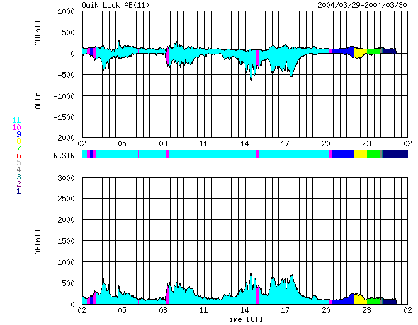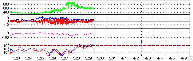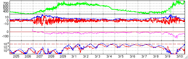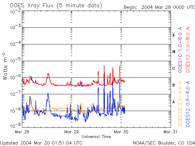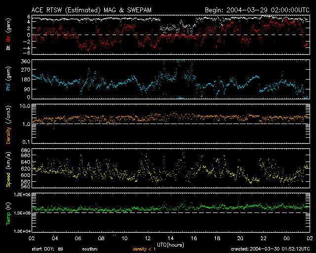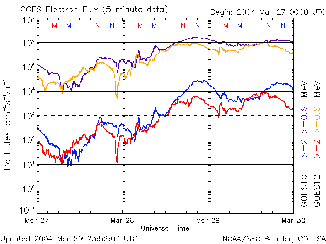 2004/ 3/30 10:51 更新 太陽風速度は高速のままです。放射線帯の電子が増加しています。 担当 篠原 太陽でフレア(太陽爆発)活動がやや活発になっています。 太陽の中心付近に位置している582黒点群が、29日21時(世界時29日12時)頃から急に活動を強め、 Cクラスの小規模フレアを頻繁に起こしています。 今朝、30日8時(世界時29日23時)にはC8の大きめの小規模フレアを起こしています。 中規模フレアへの注意は必要の様です。 ACE衛星の観測によると、太陽風の速度(黄色線)は600km/秒と高速な状態が続いています。 太陽風の磁場(白線)は5nT程度と強いものではありません。 オーロラ活動に強く影響を及ぼす南向きの成分(赤線のマイナス方向)が時々現れていますが、 -3nT程度と弱かったため、磁気圏内は比較的穏やかでした。 AE指数を見ると、500nT前後のオーロラ活動が見られた程度で、 高速風による大きな乱れにはなっていません。 静止衛星軌道の高エネルギー電子は、 GOES-10衛星(青線)に続いてGOES-12衛星(赤線)もほぼ10の4乗の線に達しました。 衛星の運用では今後数日間注意が必要でしょう。 27日周期グラフからの推測ですが、高速太陽風はもう1日半程度続くと思われます。 前周期の傾向と同じであれば、このまま磁気圏が大きく乱れることはないでしょう。 その後は、4月4日頃まで静穏です。 GOES衛星の太陽X線データ (c) NOAA/SEC ![]() ACEが観測した太陽風の磁場(1番上の枠、白線は全体の強度、赤線は南北成分) および、太陽風の密度(3番目の橙線)、速度(4番目の黄線) (c) NOAA/SEC ![]() リアルタイムAE指数 下段のAEグラフの値が高くなると、オーロラ活動が活発化しています。 (c) 京都大学, CRL ![]() GOES衛星による、静止衛星軌道における高エネルギー電子の変化 (c) NOAA/SEC ![]() 27日の太陽周期に合わせたデータプロット (放射線帯電子版) 太陽が同じ面を地球に向けていた27日前の変化から、今後を予想することができます。 (c) CRL