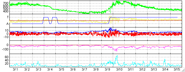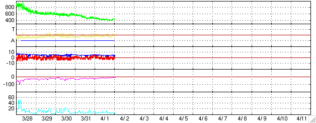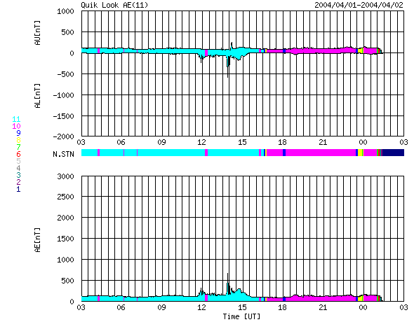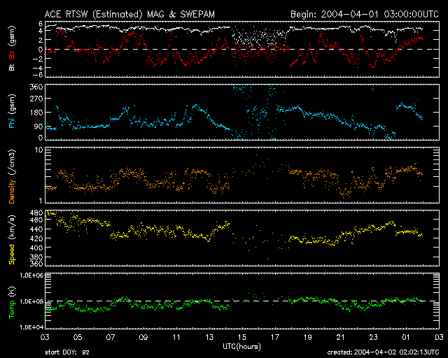 2004/ 4/ 2 11:01 更新 今夜、衝撃波の到来があるかもしれません。小規模な磁気嵐に発達する可能性もあります。 担当 篠原 31日21時(世界時31日12時)に最大に達したC3.4の小規模フレア(太陽爆発)に伴って、 full halo CME (太陽から円を描く様に太陽ガスが放出されて見える現象)が観測された様です。 発生源が太陽の中心付近だったので(1枚目の写真。中心やや上に光っています)、 地球に向かってガスが放出された事を示しています。 今夜から明日にかけて、このガスが地球へ到来し、磁気圏に擾乱を起こす可能性があります。 太陽風の速度・密度が急に上昇します。 この影響で、磁気嵐が発達したりオーロラ活動が活発になると予想されます。 ただし、フレアが小規模だったので擾乱は小規模なものに留まるでしょう。 太陽風の速度は450km/秒前後を推移しています。 オーロラ活動も低調で、AE指数はほとんど変化していません。 目立った衝撃波が届かなければ、このまま4日頃まで静穏な状態が続くでしょう。 (27日周期の図を参考にして下さい) 静止軌道の高エネルギー電子の密度は減少し、注意レベルと言われる10の4乗の線を切っています。 GOES衛星の太陽X線画像による太陽フレア。31日21時(世界時31日12時) (c) NOAA/SEC ![]() ACEが観測した太陽風の磁場(1番上の枠、白線は全体の強度、赤線は南北成分) および、太陽風の密度(3番目の橙線)、速度(4番目の黄線) (c) NOAA/SEC ![]() リアルタイムAE指数 下段のAEグラフの値が高くなると、オーロラ活動が活発化しています。 (c) 京都大学, CRL ![]() 27日の太陽周期に合わせたデータプロット (太陽風版) 太陽が同じ面を地球に向けていた27日前の変化から、今後を予想することができます。 (c) CRL