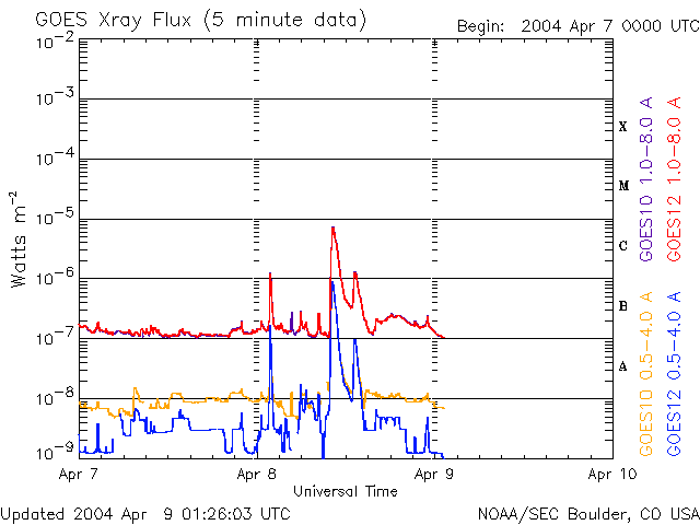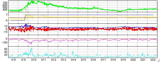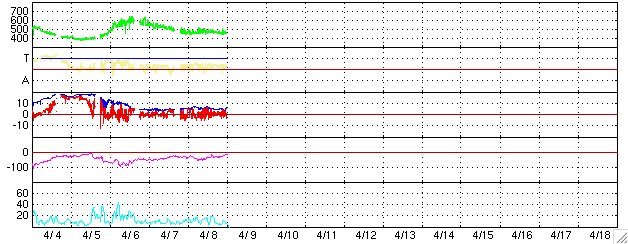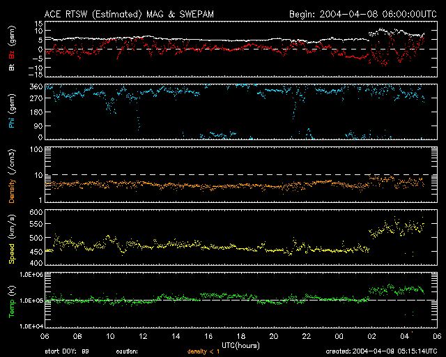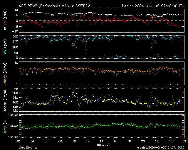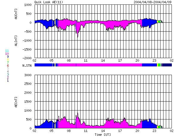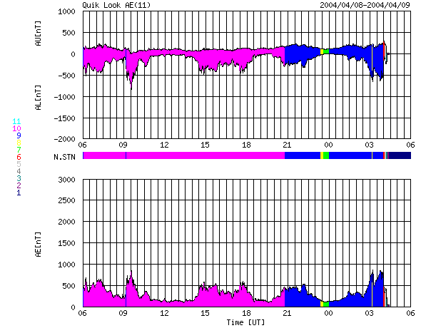 2004/ 4/ 9 14:16 追加 ACEが観測した太陽風の磁場(1番上の枠、白線は全体の強度、赤線は南北成分) および、太陽風の密度(3番目の橙線)、速度(4番目の黄線) (c) NOAA/SEC ![]() リアルタイムAE指数 下段のAEグラフの値が高くなると、オーロラ活動が活発化しています。 (c) 京都大学, NICT ![]() | ||||||||||||||||||||||||||||||||||||||||||||||||||||||||||||